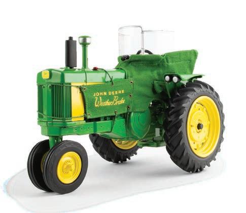 Constructed with die-cast body and configured with Roll-o-matic narrow front axle. Equipped with Weather Brake heat houser. Features rear wheel weights, gas engine details, precleaner air cleaner, and detailed operators station. 3-point hitch raises and lowers.