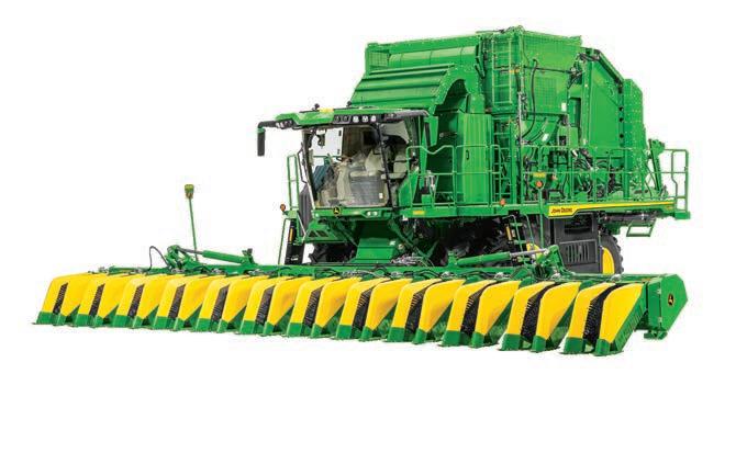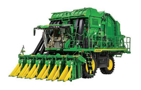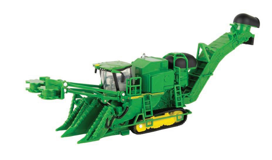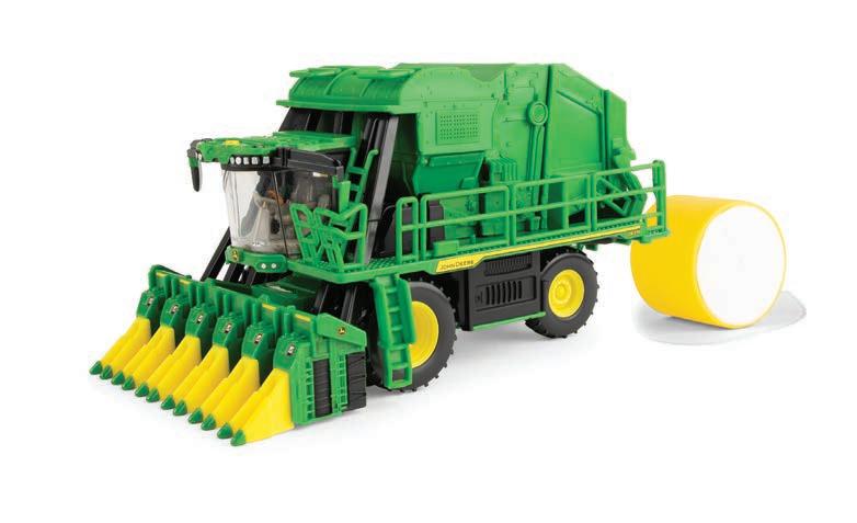 This set commemorates the 75 years of John Deere cotton pickers. Both units are constructed with die-cast metal. Clear cab windows reveal detailed interiors. Opening rear bale chambers allow the cotton bale onto the unloading ramp. The cotton stripper is equipped SHF12F header that raises and lowers. Additional features include external mirrors, railings, and light details. Set also includes 2