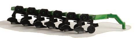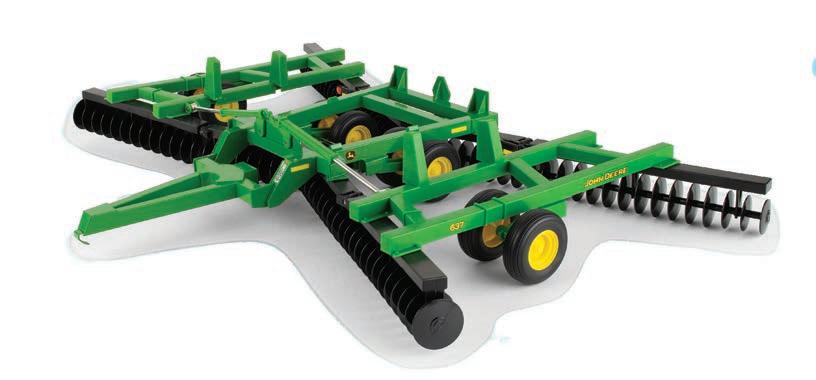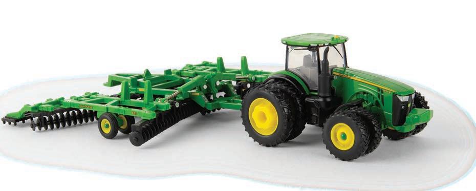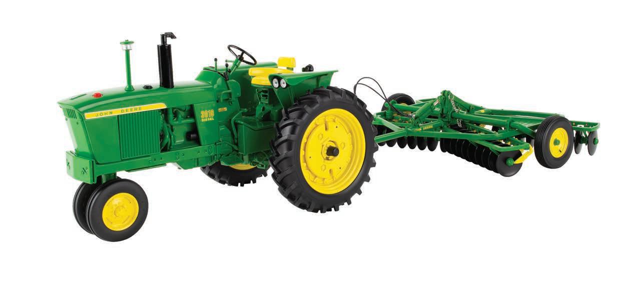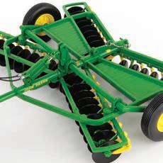 The second John Deere item in the Precision Heritage series. The tractor features die-cast construction. It is configured with a narrow front axle and equipped with an authentic style hitch. The disk is constructed with a die-cast frame and disk blades. The implement hitches to the tractor and features linking hydraulic details.