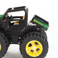 Constructed with die-cast body and front axle. Configured with rear duals and oscillating front axle. Features opening hood which reveals engine detail and opening cab door with detailed cab interior. Additional features include pivoting warning arms, mirrors, and rear 3-point hitch that raises and lowers.