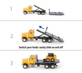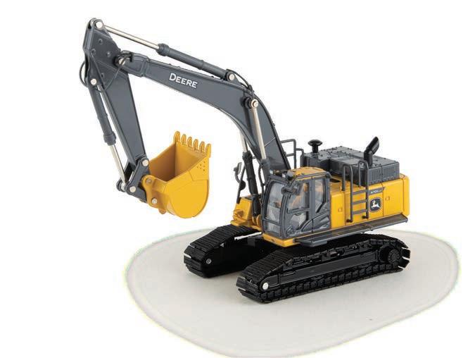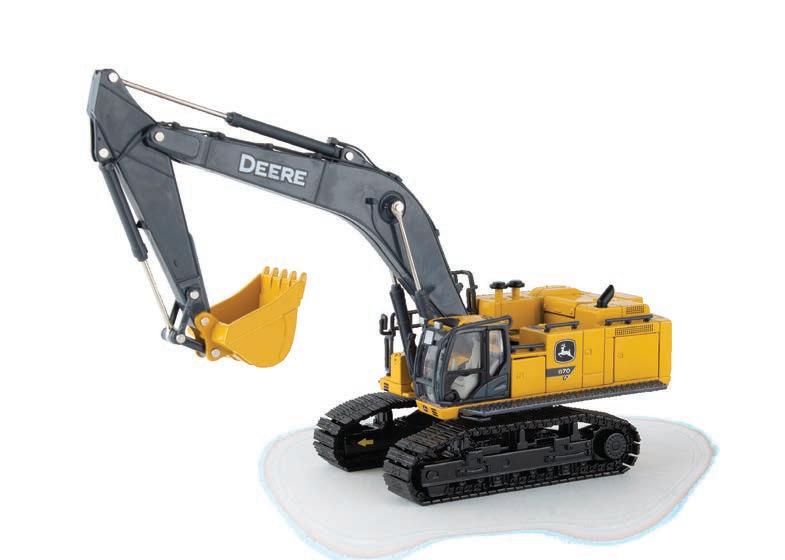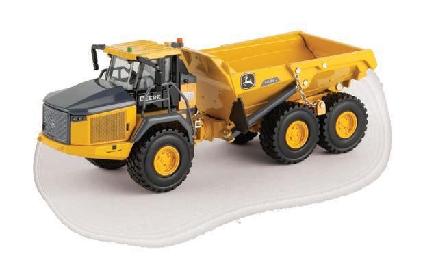 Represents the 13.6L diesel engine. Updates include engine details, right side body panel, and exhaust stack. Constructed with die-cast frame, drawbar, and track frames. Configured with front and rear tracks. Features articulated frame, opening hood, and authentic style rear drawbar. Opening left side cab door and clear cab windows reveal a detailed interior. Includes light detail and pivoting mirrors.