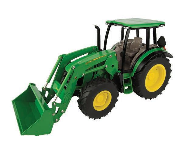 Constructed with die-cast body, hood, and wide front axle. Cab features include clear windows and opening cab door that reveals detailed interior. Features soft feel tires on die-cast wheels and rear 3-point hitch that raises and lowers. The tractor is equipped with the quad range transmission.