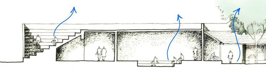 The transition spaces provide with important moments between the structures that makes the visitors slow down and pause.