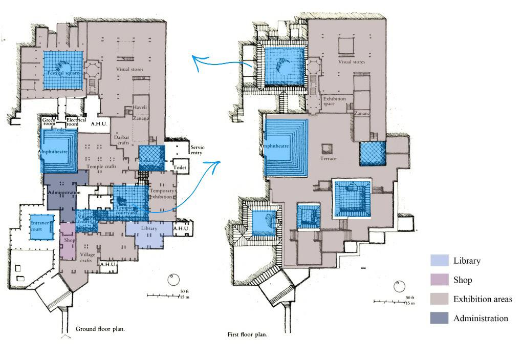Charles Correa has inspired from the great Buddhist and Hindu temples of the past such as those in Bali (Besaki), Java (Borobudur) and southern India (Srirangam) which are structured around an open to sky ceremonial path. The crafts museum is organized around a central pathway, revealing a sequence of spaces along the pedestrian spine