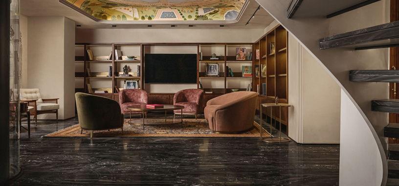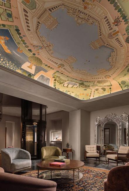 The lower ground floor features a library lounge and four private pods for personalized client interactions, designed with frescoes depicting regional architecture and flora. Artisans specializing in miniature painting developed these frescoes over several months, adding a handcrafted touch to the space. The careful planning ensures that the retail experience feels intimate and personalized, with service corridors allowing for discreet interactions.