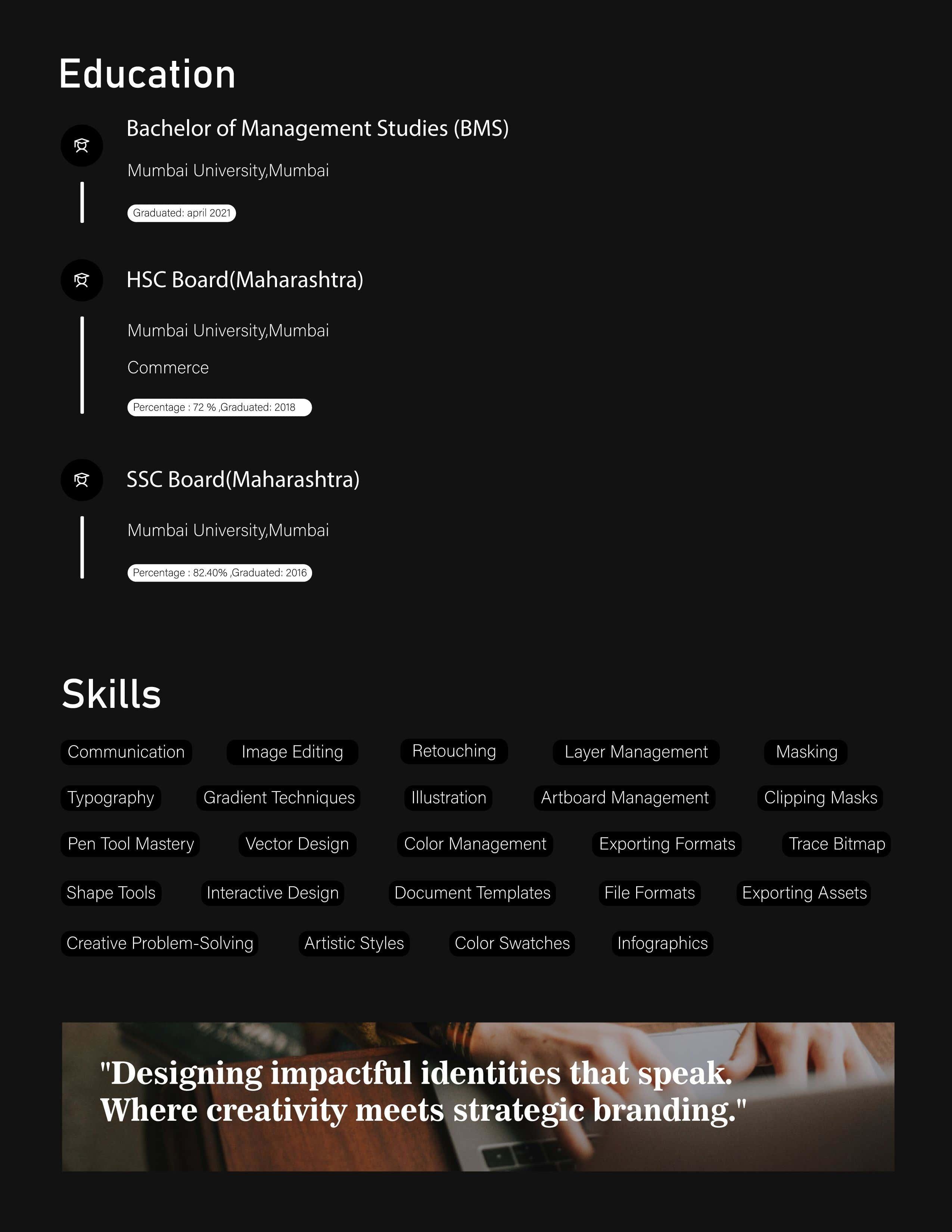 As a passionate Graphic and Brand Designer, I specialize in creating visually compelling and strategically sound designs that resonate with audiences and elevate brands. With extensive experience in Adobe Photoshop, Adobe Illustrator, and CorelDRAW, I bring a versatile skill set that allows me to tackle a wide range of design projects, from logo creation and brand identity to marketing materials and digital graphics.