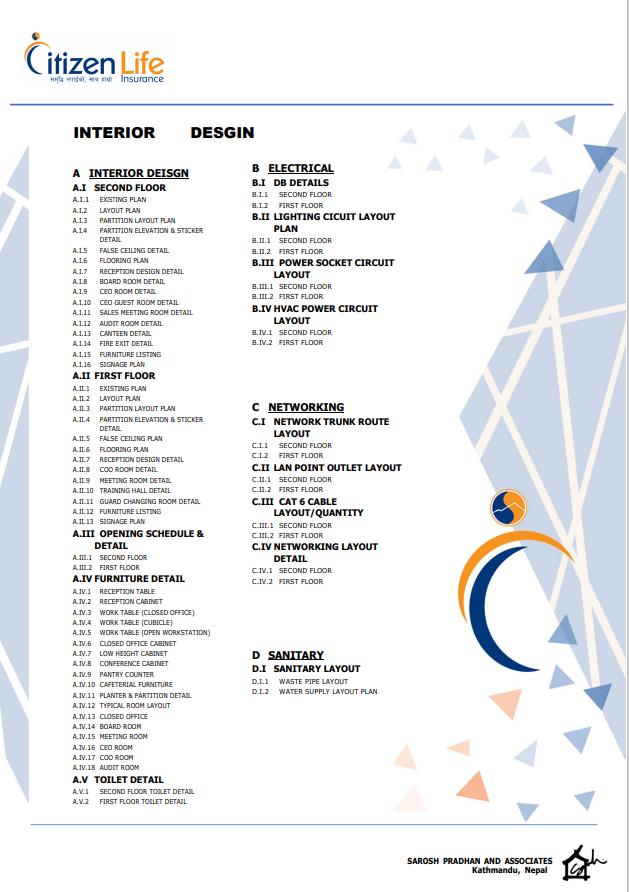 During the period, I got to learn about the verity of works from corporate interior, social projects, architecture in mountains ; challenges and opportunity. I got to learn the about the project beginning to conceptualization to finalization through the citizen life insurance interior project which initiated during my trainee period. I also closely studied the client’s requirement and involved in the initial design stage. I got the join the professional client meeting through CLICL, Autism Center etc. These helped me how to deal with the client. I involved in market survey, wall painting, model making with my fellow interns and get the tips and tricks from them as well.