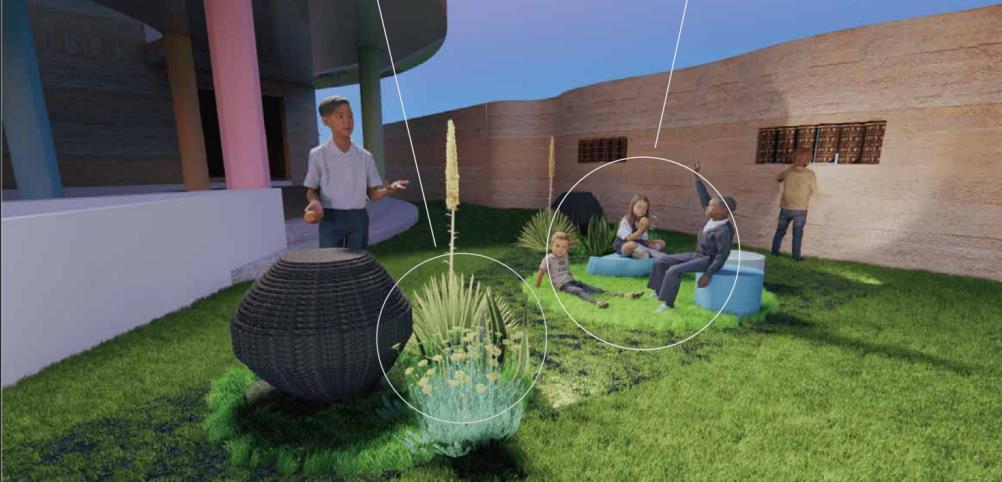 The use of parametric roof supported by steel columns in the central courtyard stands in contrast to use of Rammed Earth in the surrounding courtyards. The surrounding landscape is an untouched piece of land representing our natural heritage with its natural terrain that can be accessed from the courtyards.