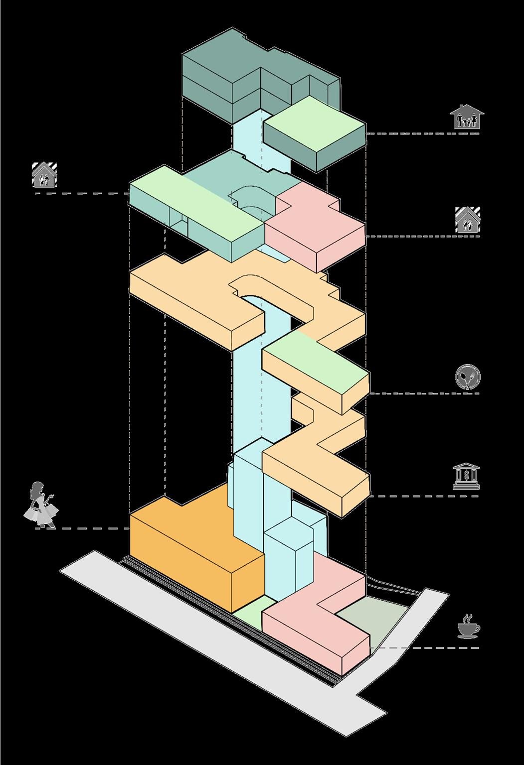 Throughout the process, the software used for the competition was miro board for conceptual idea sharing along with sketchbooks, sketch up for form development, enscape for basic render, Photoshop & illustration for enhancing the image visualization. Different method of collage renders and illustrated diagram are used as a graphical representation.
