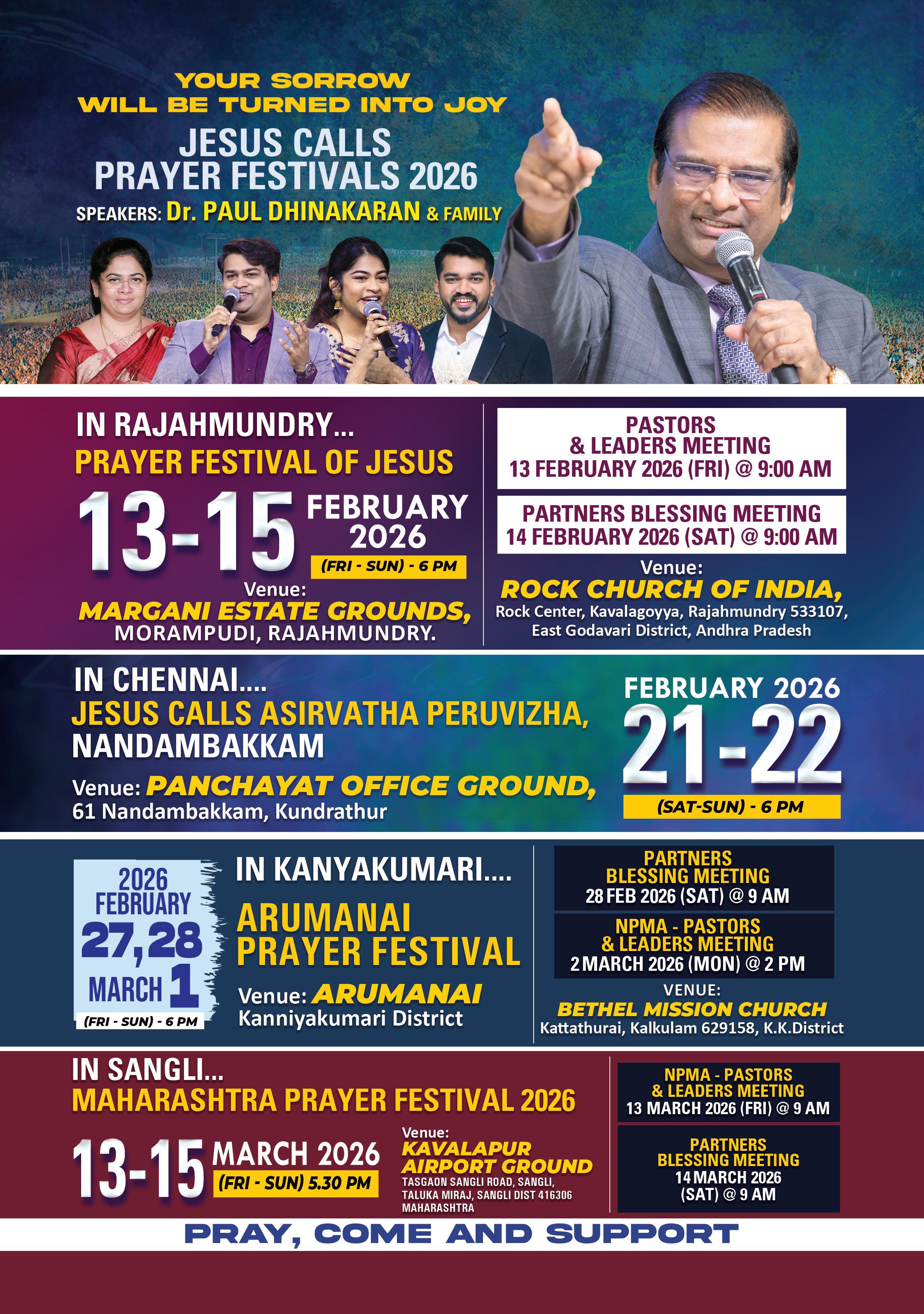 13th to 15th March – Prayer Festival, Sangli, Maharashtra 14th March 2026Partners Meet, Sangli, Maharashtra