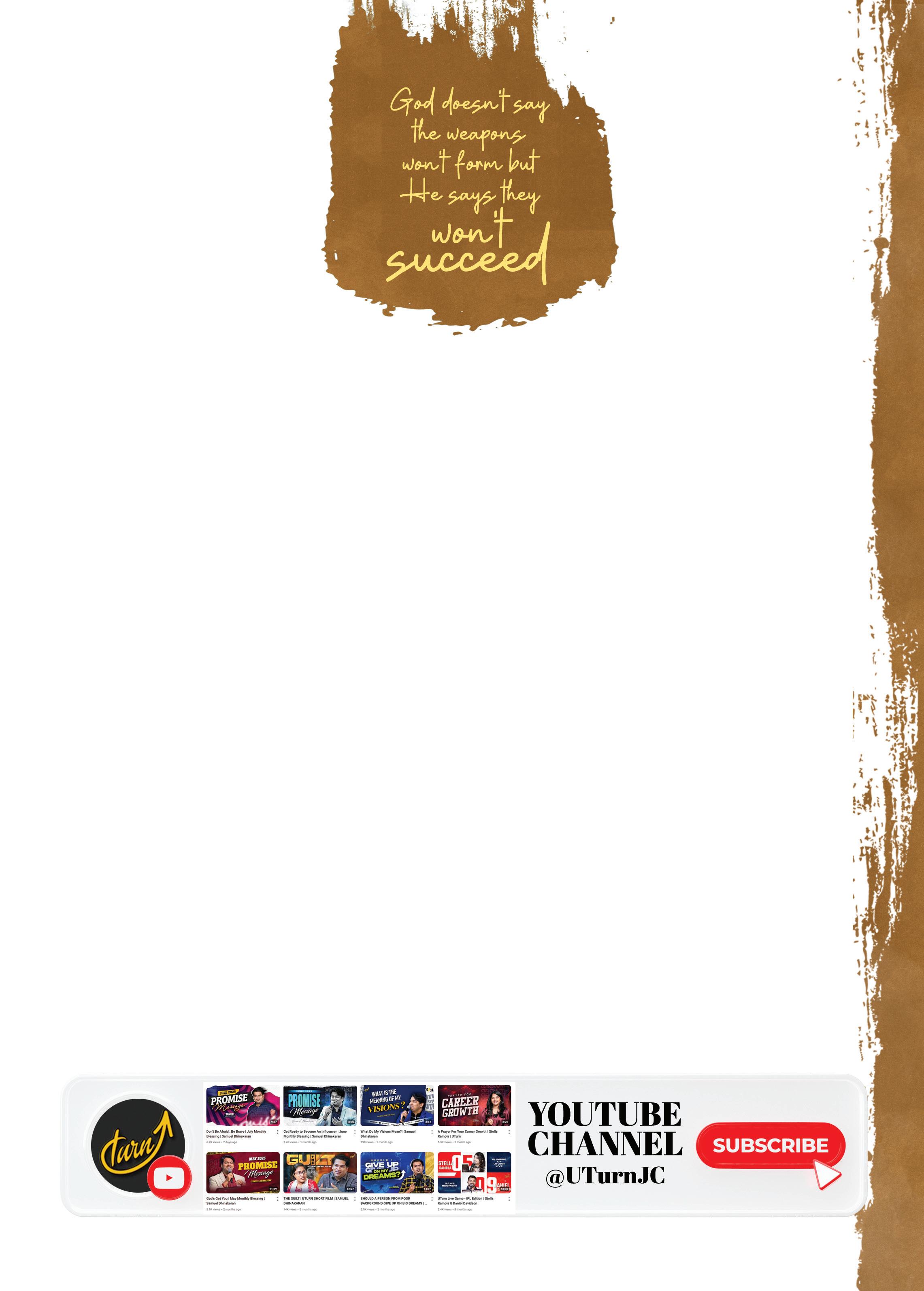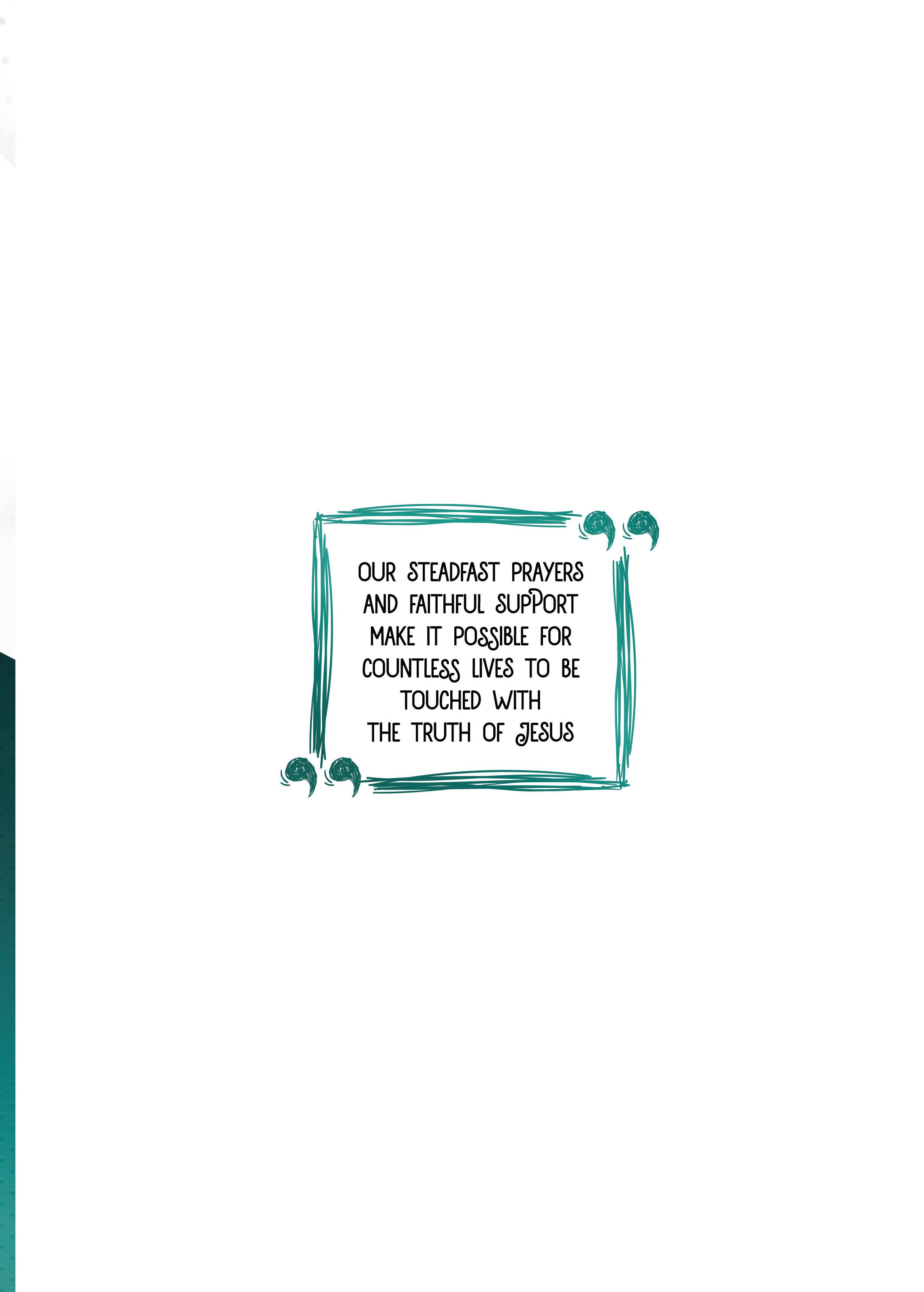 Dear partner, your labour in the Lord is not in vain but is bearing fruit in countless lives. Stand firm and letnothing move you, always giving yourself fully to the work of the Lord (1 Corinthians 15:58). Together, let us press forward in faith until His kingdom is revealed in fullness. I bless you in the name of the Lord and assure you my heartfelt prayers for you.