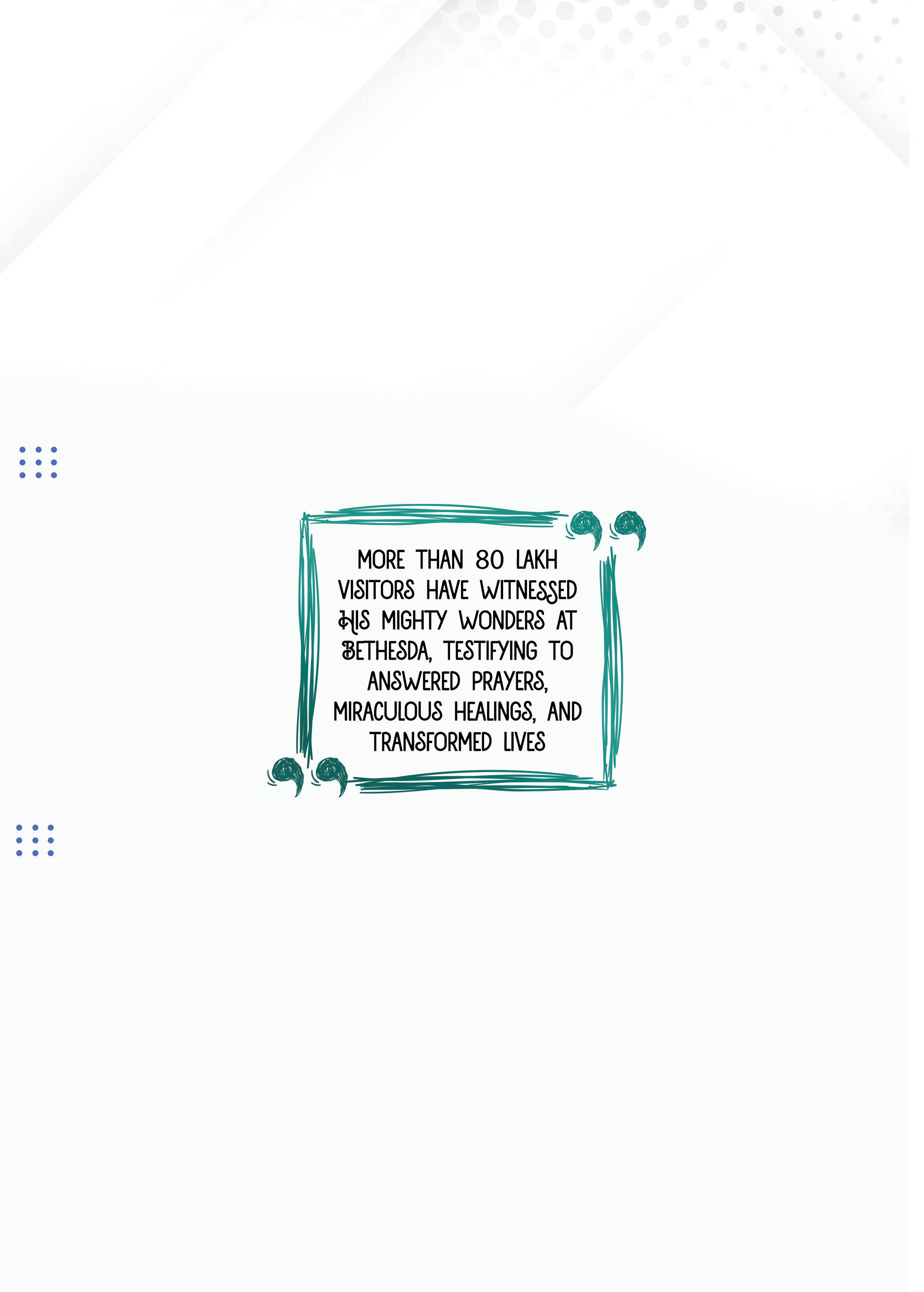 From April 2024 to March 2025, Bethesda Prayer Center has ministered to 2,56,400 souls, each experiencing the touch of God. To carry forward this mission and to reach the 31,59,000 people in Coimbatore as well as to bless all its visitors, Bethesda requires atleast 600 voluntary prayer intercessors each month, 100 Ambassadors, and around 300 extended volunteers to help as worship, music, and care teams for this mission.