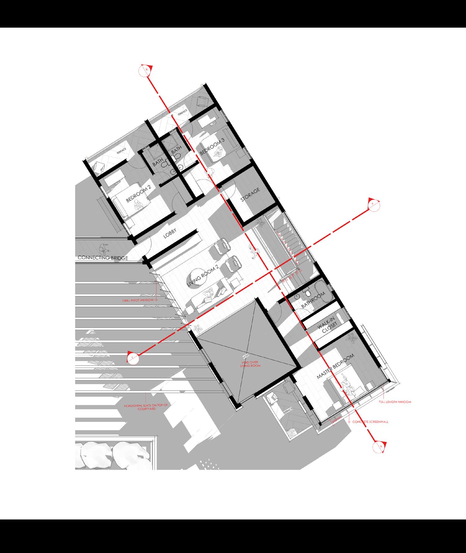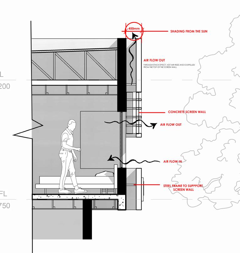 The screen wall functions as a passive shading device while maintaining ventilation. Integrated air voids allow continuous airflow into the bedroom, promoting cross-ventilation. A recessed opening at the top of the screen enables hot air to escape through the stack effect, improving thermal comfort without mechanical systems. This facade strategy balances privacy, shading, and natural ventilation.