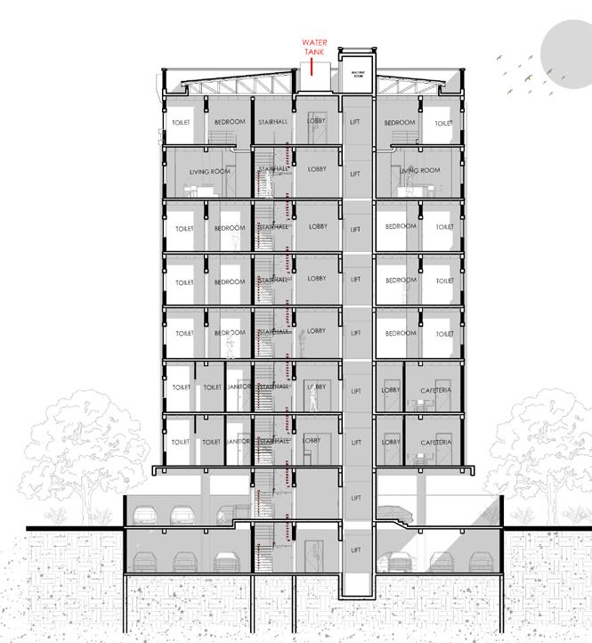 The building consists of a ground floor and a basement level. The basement provides additional parking, as the ground floor alone could not accommodate sufficient spaces for the development.