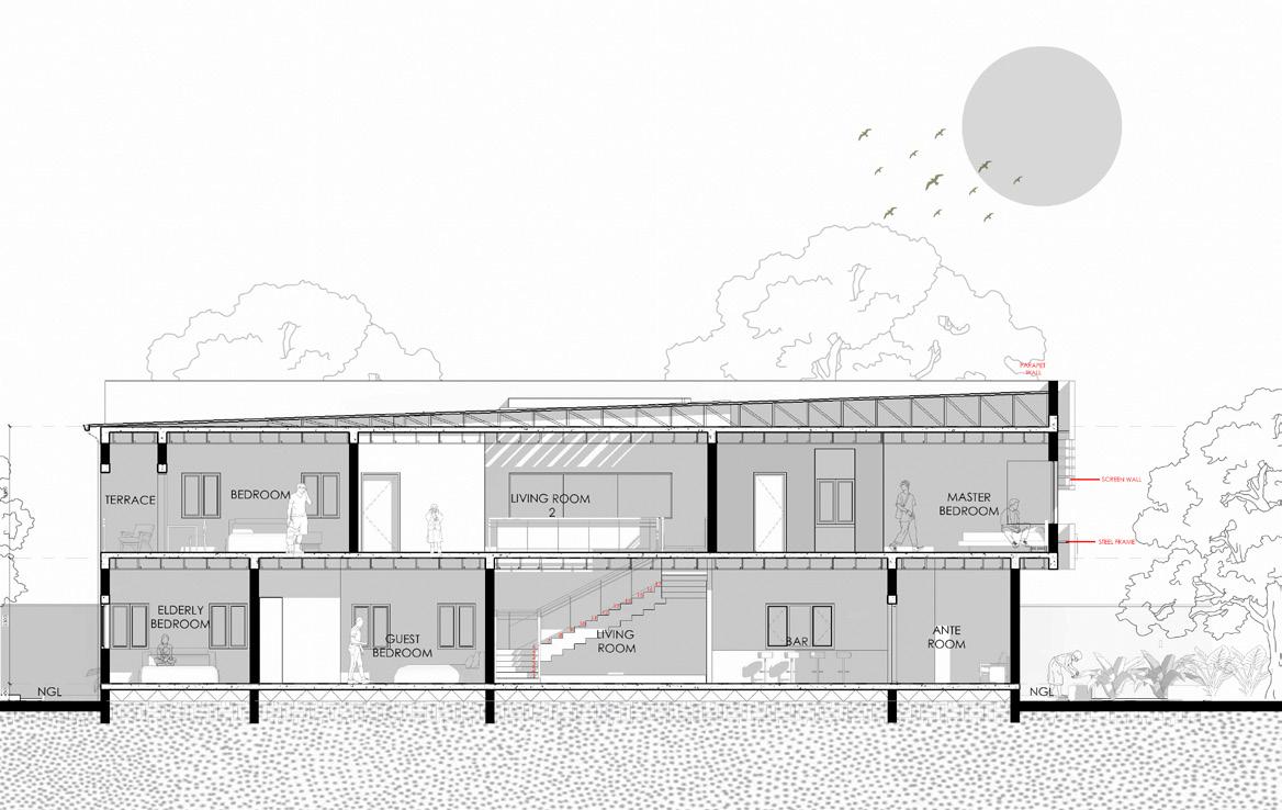 Drawing inspiration from natural habitats, the house is designed for selfsufficiency through solar energy, rainwater harvesting, and passive ventilation strategies.