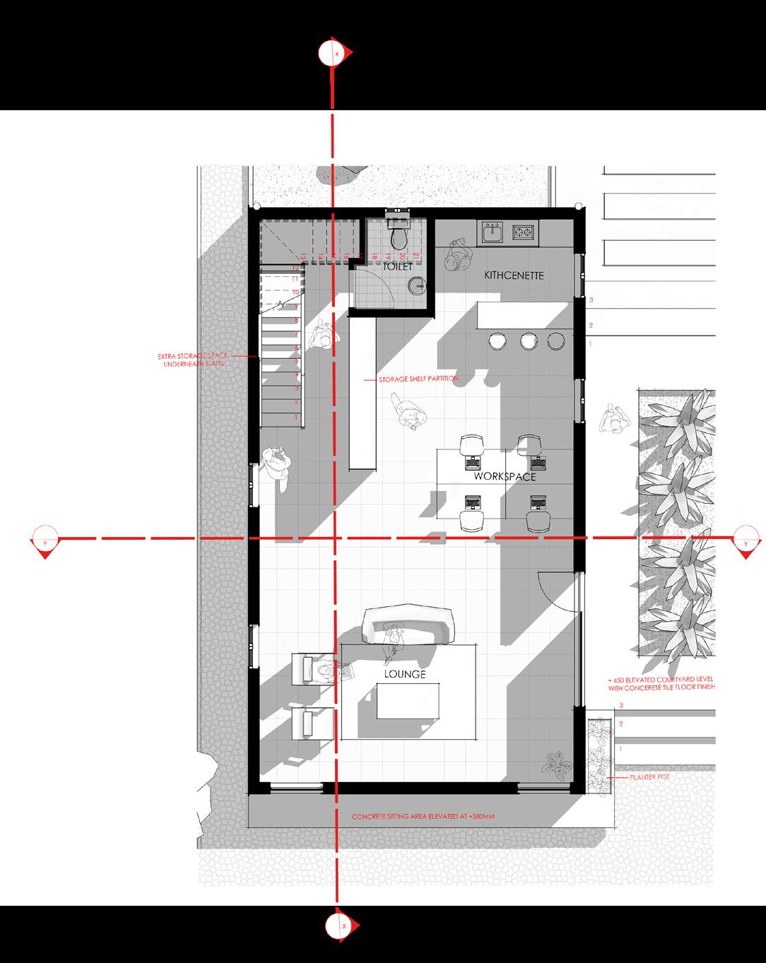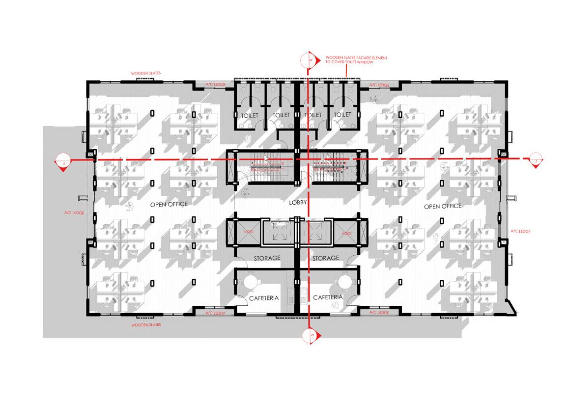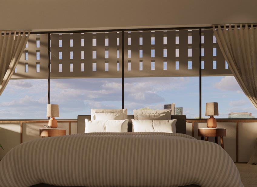 The sixth floor continues the residential programme with loftstyle one-bedroom apartments featuring larger living areas and kitchens. This level also includes a terrace accessible to both residents and employees, providing a shared space for relaxation and social interaction.