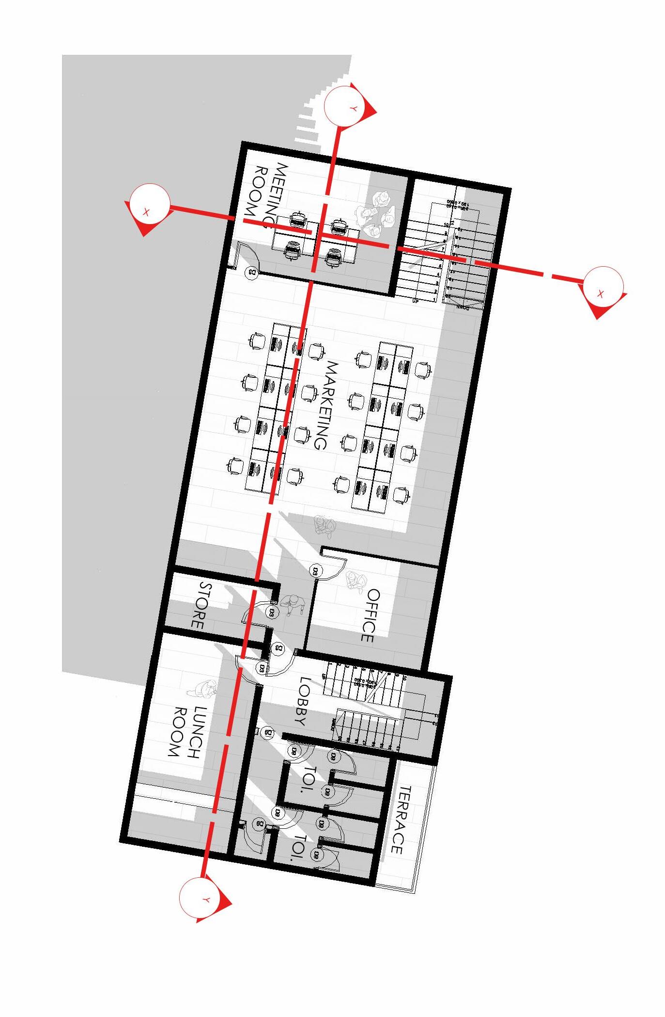 Second Floor: The second floor contains administrative offices (terminal manager, operations, accounting, and customer service), as well as CCTV and server rooms. A void above the waiting area enhances visual connection, spatial openness, and operational oversight.