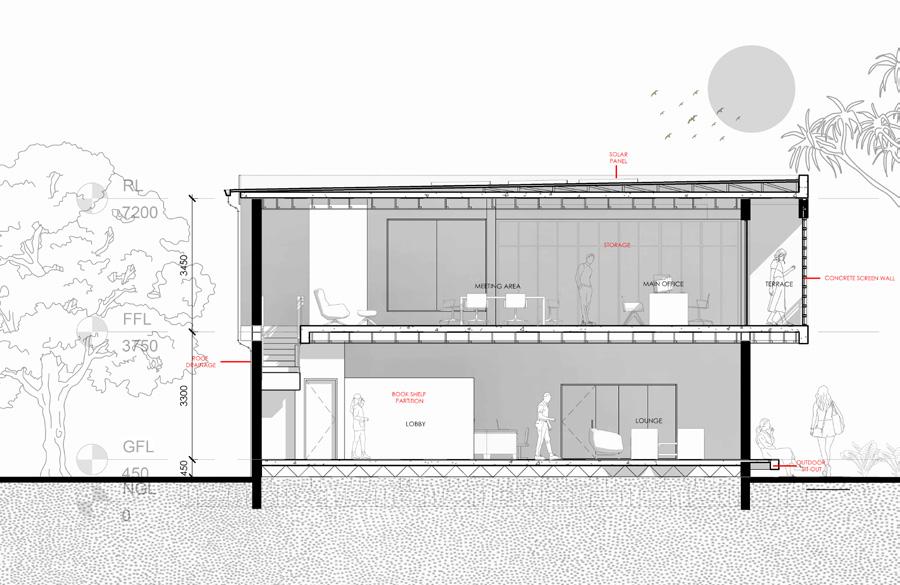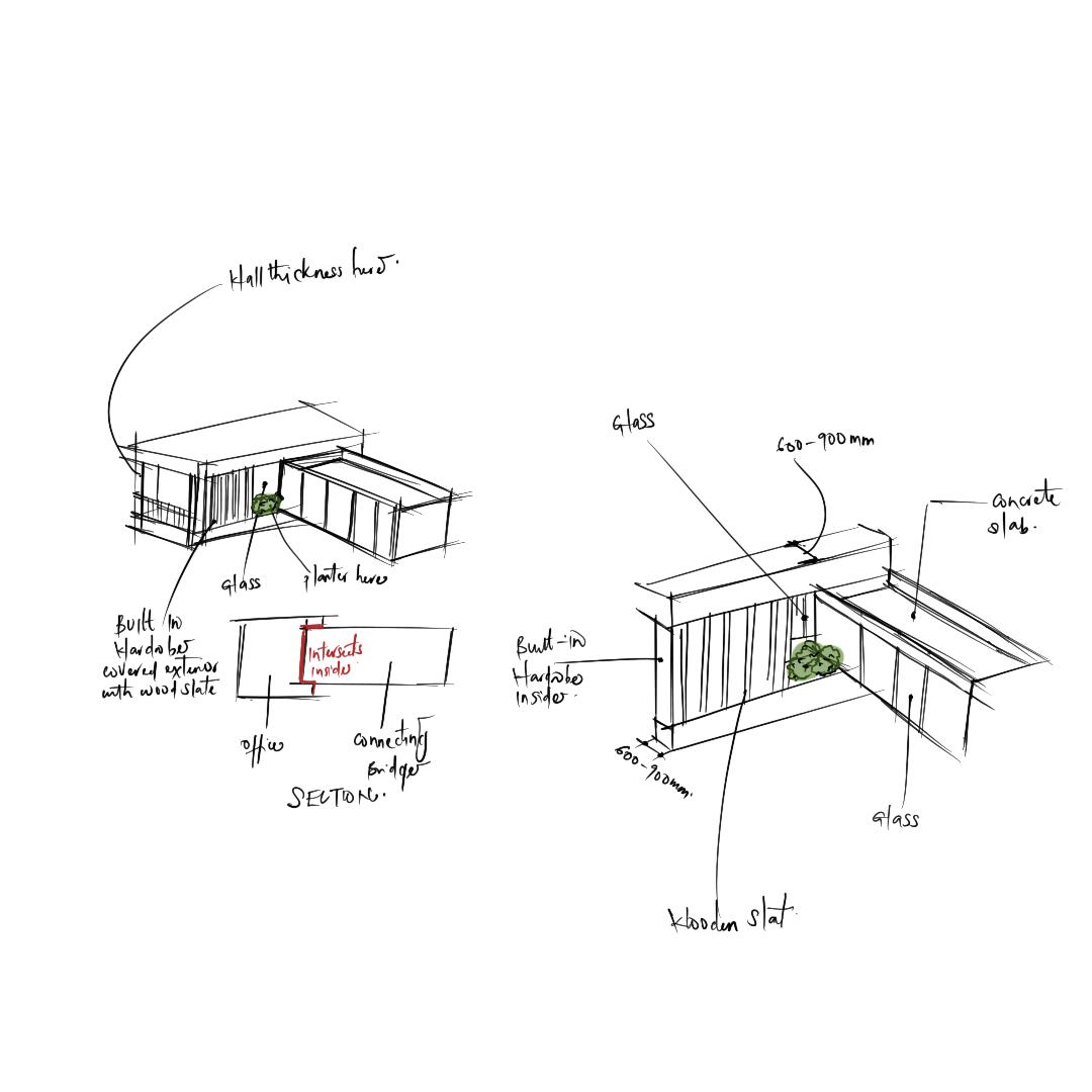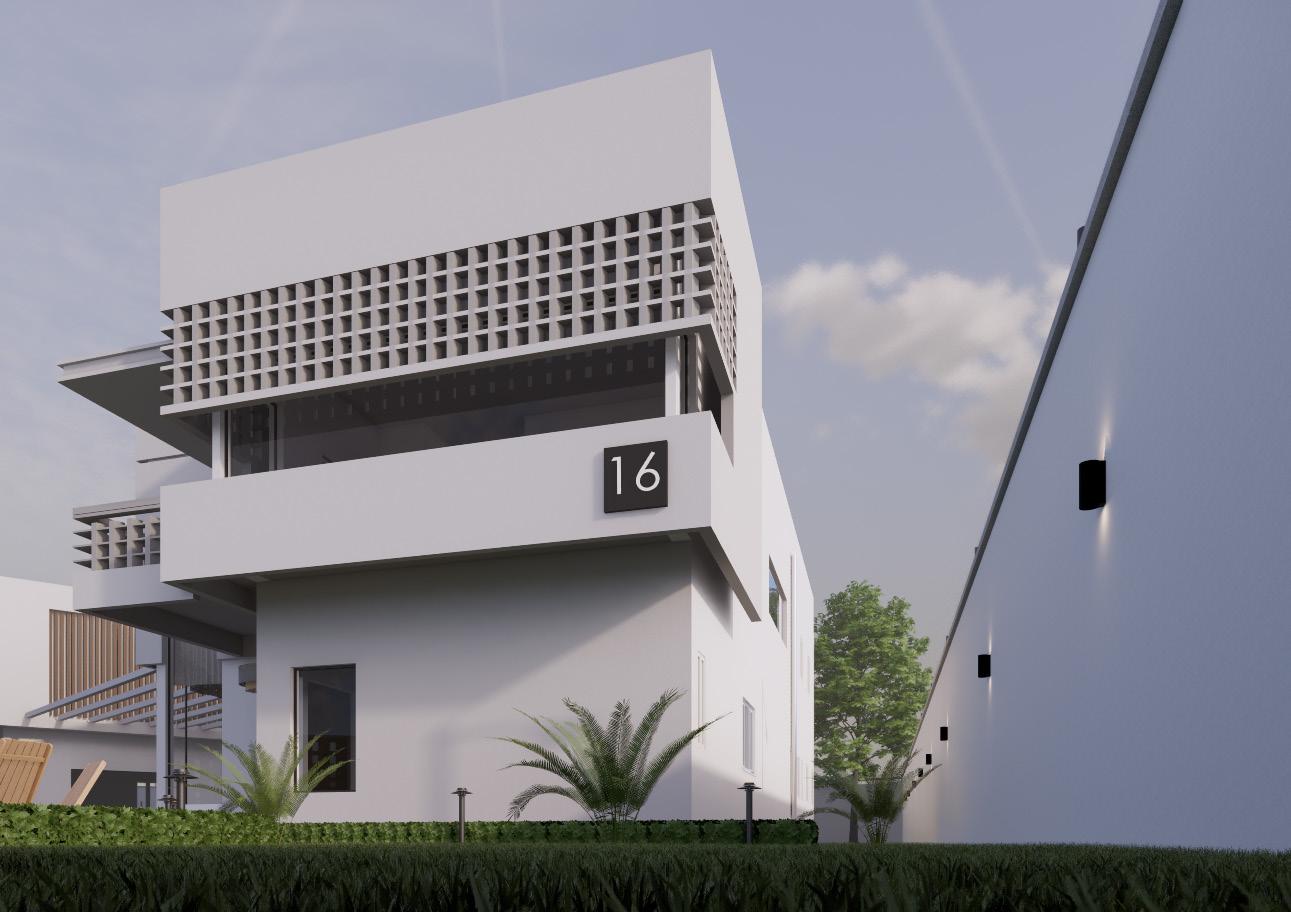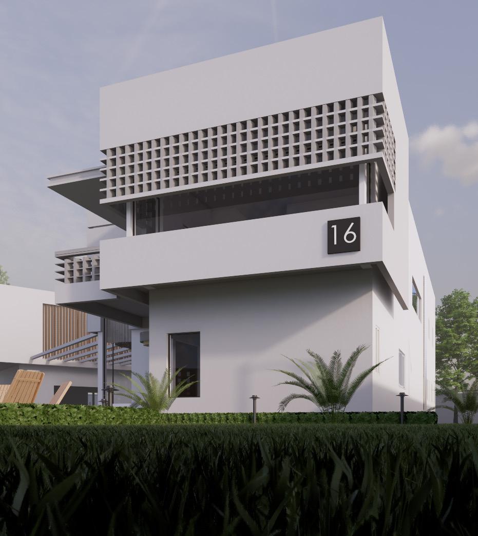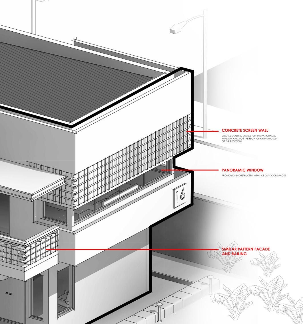 The facade plays a critical role in the overall environmental performance of the building. To moderate solar exposure and reduce visual monotony, a concrete screen wall was introduced at the front elevation, where the bedroom is located and where solar intensity is highest due to the overhead sun.