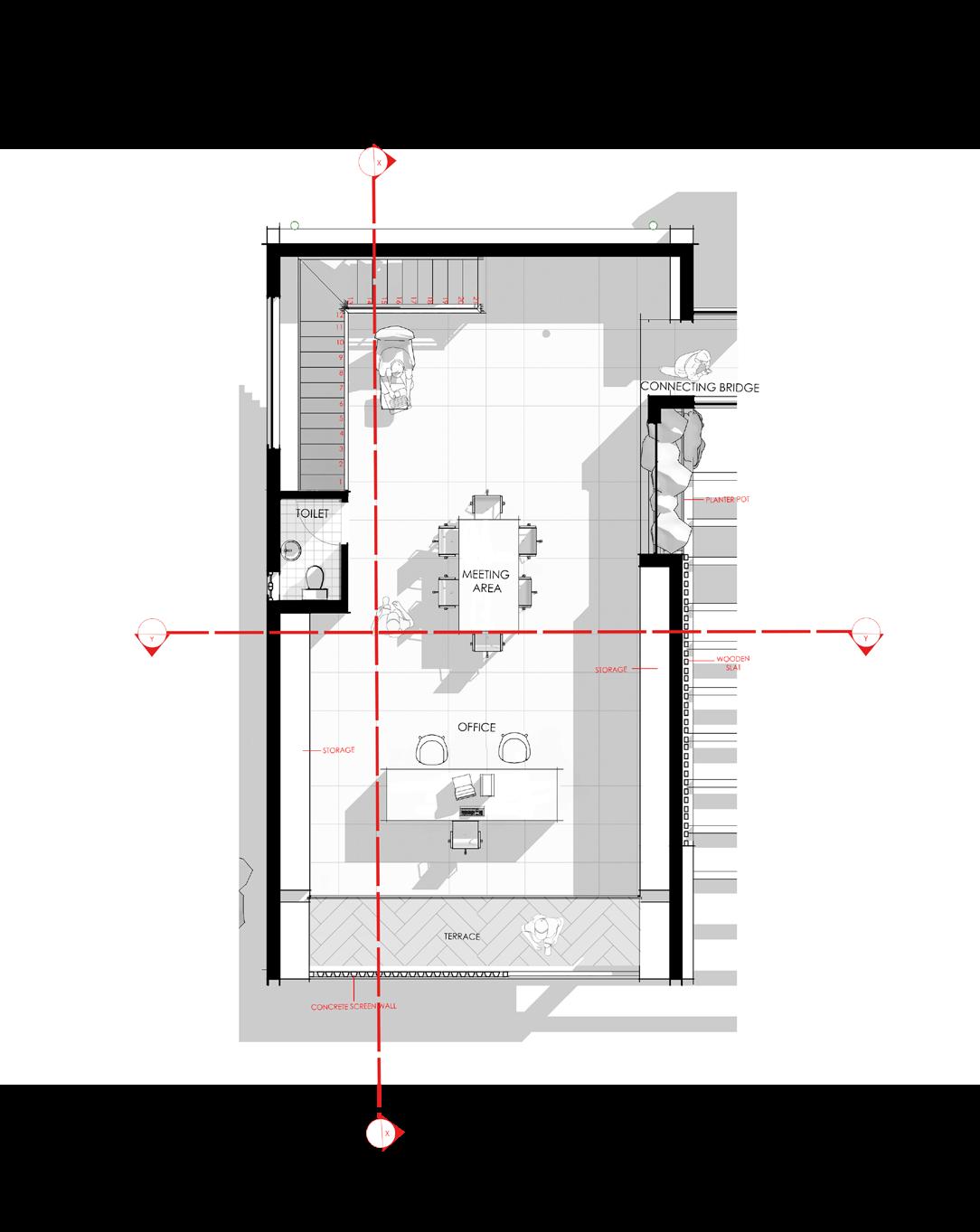 A connecting bridge links the first-floor office directly to the private residence, allowing seamless movement between work and home without re-entering the public zone.