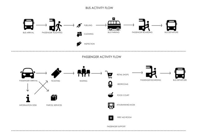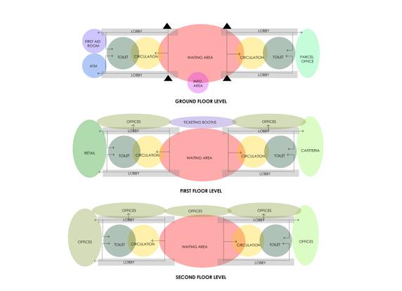 The bus terminal is a three-story building (ground plus two floors) organized to support seamless passenger movement, operational efficiency, and user comfort.