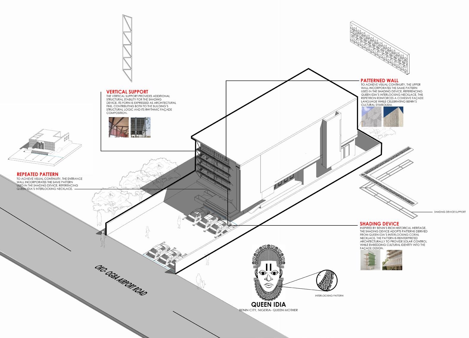 The design concept is derived from the rich cultural heritage of Benin City, Nigeria. The façade pattern draws inspiration from the interlocking links of Queen Idia’s chain, reinterpreted as a contemporary architectural motif. This pattern is integrated into the building’s shading devices and façade treatment, creating visual continuity and a strong cultural identity.