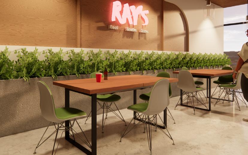 First Floor: The first floor houses ticketing booths—four for interstate and four for intrastate travel—alongside a cafeteria with outdoor seating and a flexible retail kiosk area, providing passengers with spaces to dine, shop, and wait comfortably.
