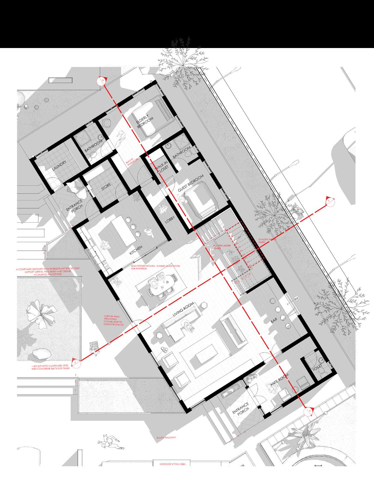The screen wall functions as a passive shading device while maintaining ventilation. Integrated air voids allow continuous airflow into the bedroom, promoting cross-ventilation. A recessed opening at the top of the screen enables hot air to escape through the stack effect, improving thermal comfort without mechanical systems. This facade strategy balances privacy, shading, and natural ventilation.