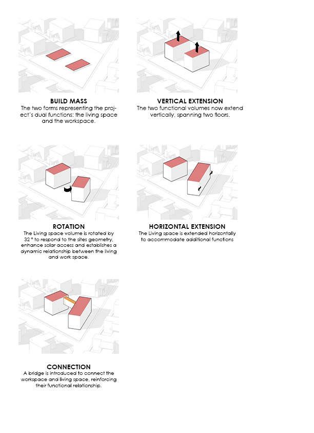 The Gico Habitat explores the balance between separation and connection. Living and working functions were organized into two distinct volumes to support focus and privacy, while a first-floor bridge reconnects them. The residential block was rotated 32 degrees in response to site conditions, informing the building’s orientation and spatial relationships.