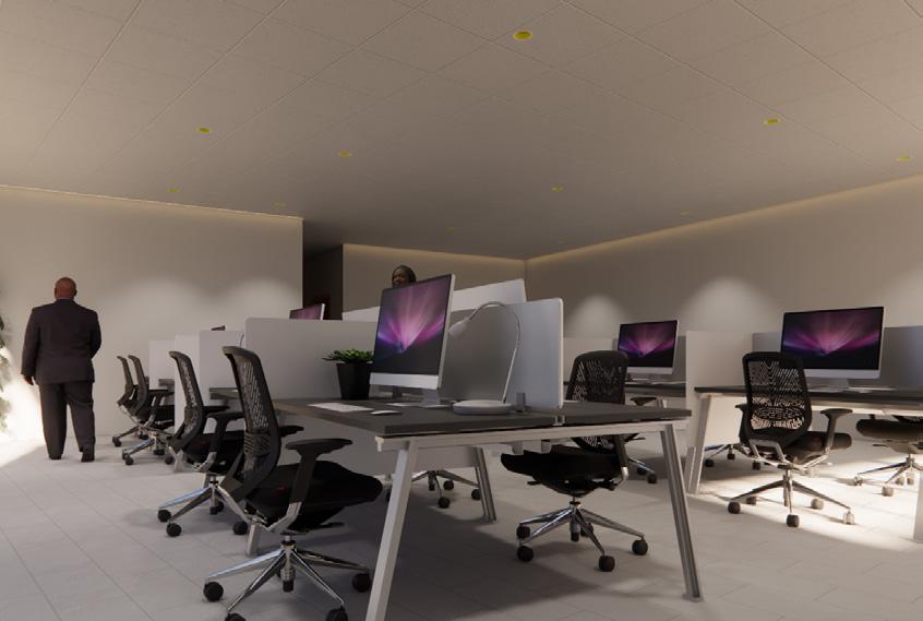 The ground floor includes workstations for four staff members, a visitor lounge, and a kitchenette, supporting both focused work and informal interaction. The first floor houses the client’s private office and a meeting room, providing a quieter environment for concentrated tasks and discussions.