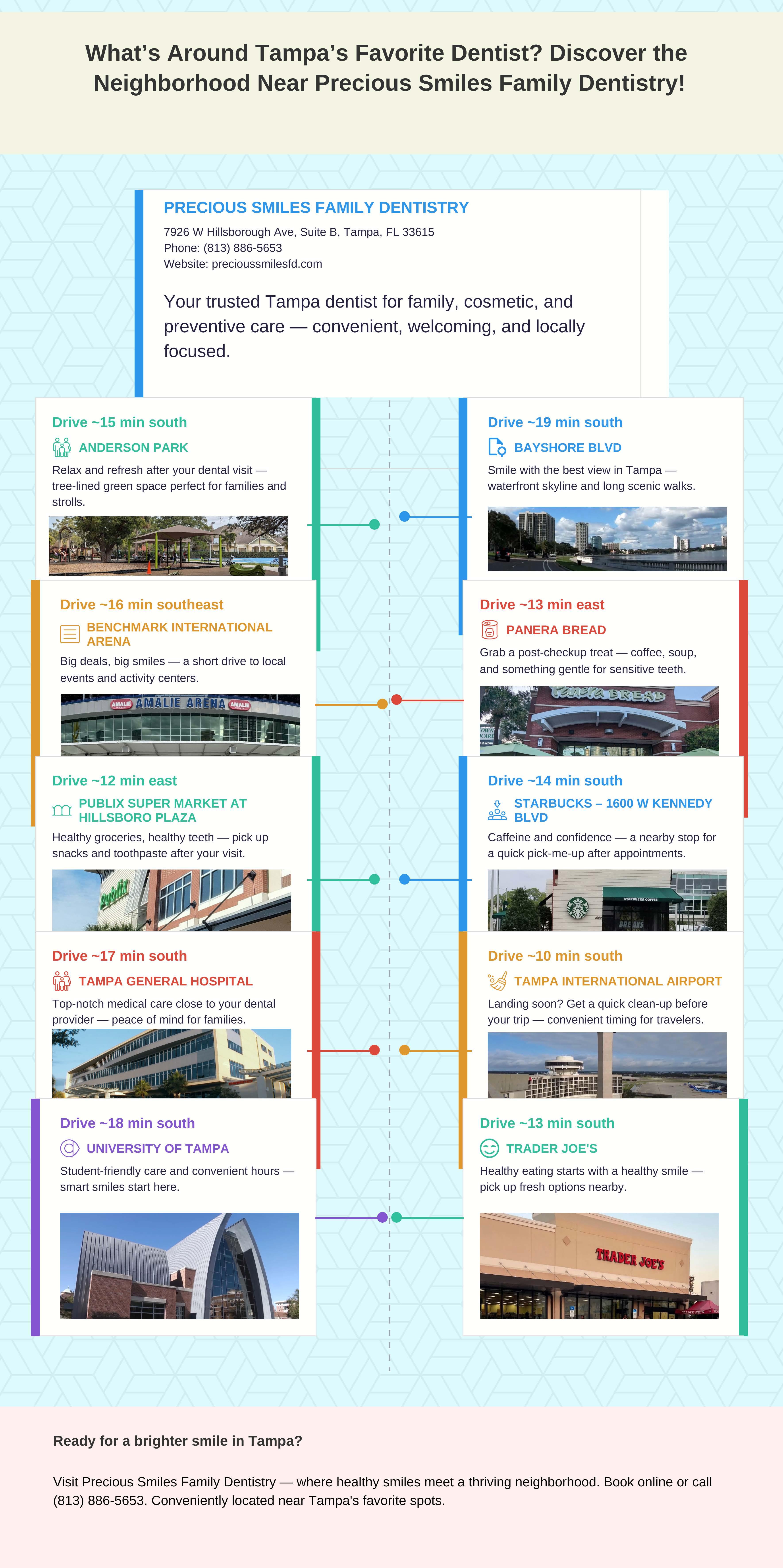 Discover the vibrant community surrounding Precious Smiles Family Dentistry — Tampa’s trusted spot for convenient, family-focused dental care. From daily errands to coffee runs and school commutes, your neighborhood dentist is always just around the corner.