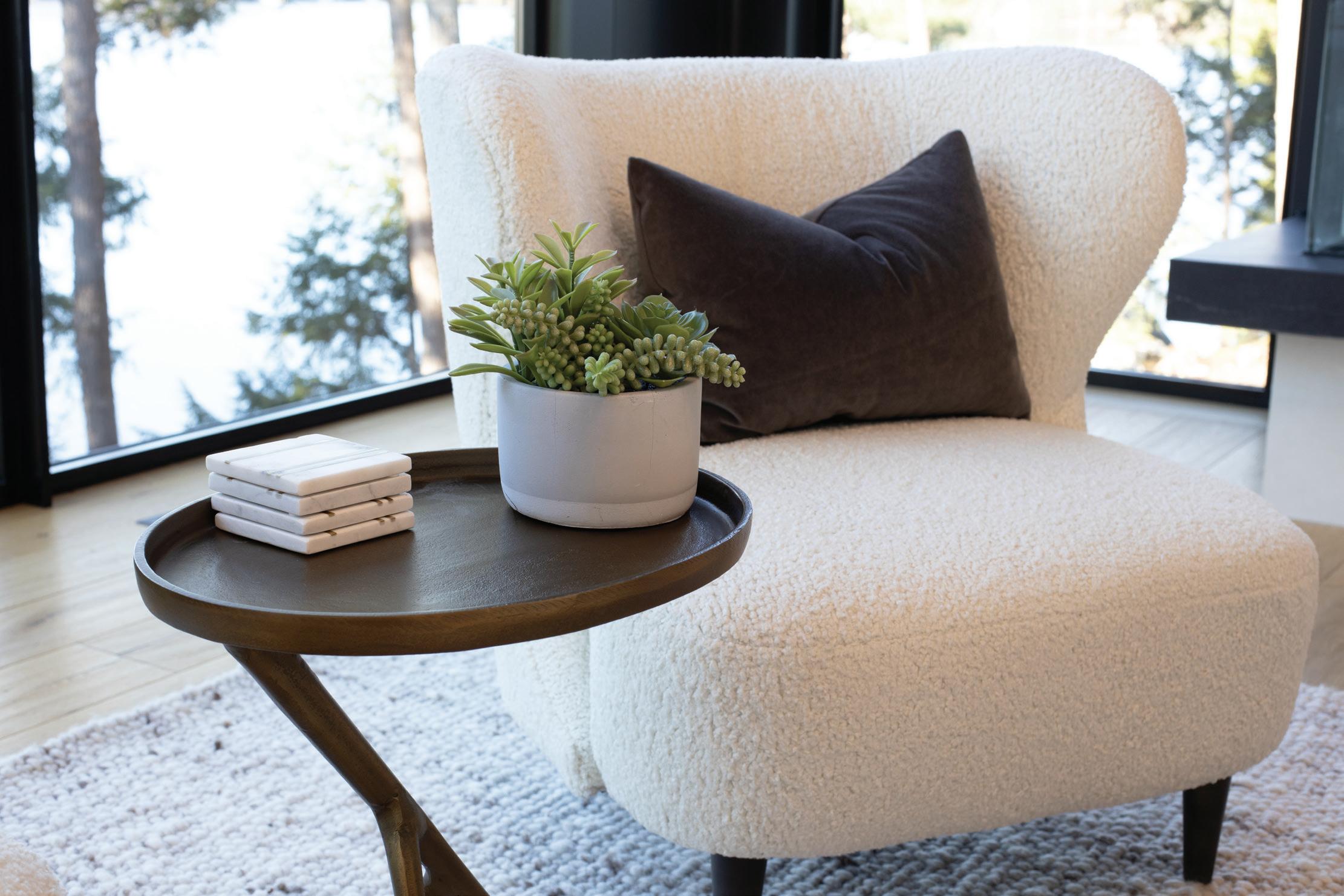 Glamorous comfort piece with faux fur alpaca seat, supported with vintage bronze base.