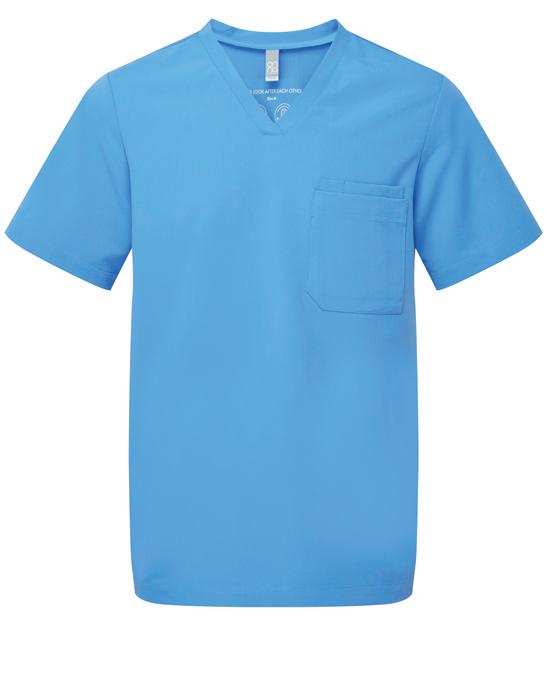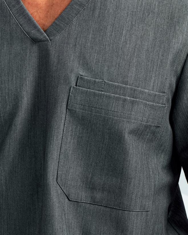 V-neck style with 3-in-1chest pocket and combined phone and pen pocket. Breathable 4-way stretch for easy movement and all day comfort. Durable, crease resistant and easycare. Modern fi with back darts and side vents.