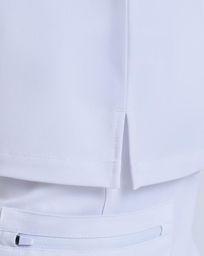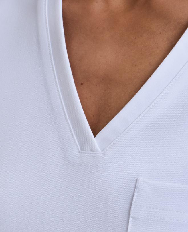 Encolure en V avec poche de poitrine unique, Tissu quadri-extensible perméable à l’air pour vous faciliter les mouvements et vous procurer un confort tout au long de la journée. Durable, infroissable et facile d’entretien. Fabriqué avec du polyester recyclé. Coupe moderne avec des pinces dans le dos et des fentes sur les côtés.