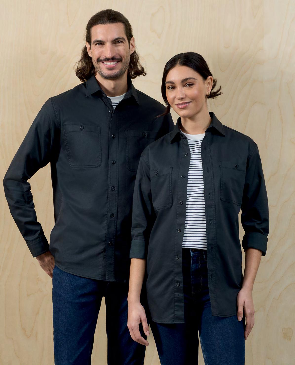 PR021 Chemise de service « Utility 2.0 » Finition grand teint, résistante à la décoloration pendant plus de 20 lavages. Contient du polyester certifié recyclé. Ample, coupe unisexe. Deux poches de poitrine à bouton 58 % coton, 39 % polyester recyclé, 3 % élasthanne, 185 g/m²