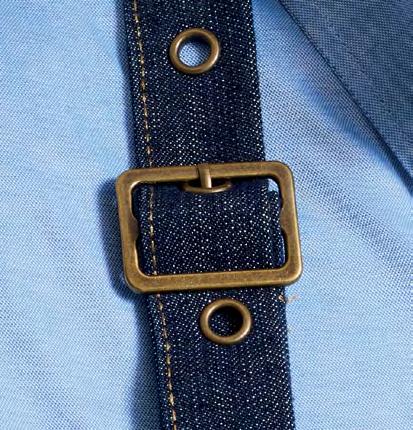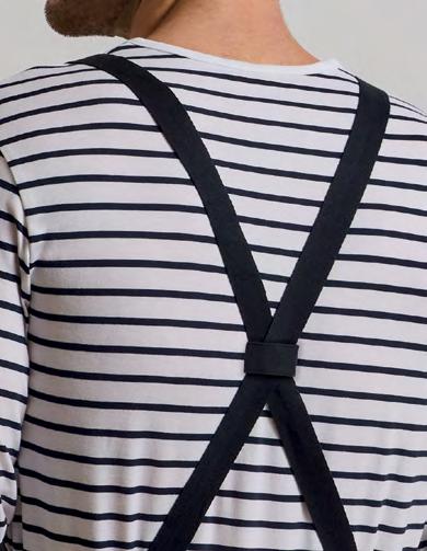 Tablier bavette qui, après rabat de la lanière autour du cou, se transforme en tablier à la taille.