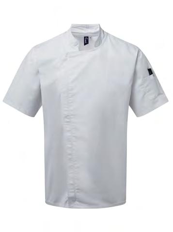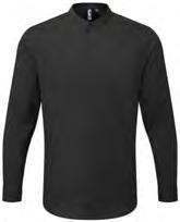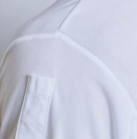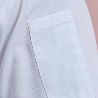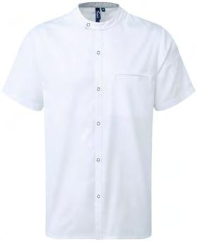 Banded neckband with press stud button fastening. Mandarin collar stand. Covered placket with two press stud buttons. Pen pocket on left sleeve. Coolchecker® mesh back panel for airflow. Side slits on the hem-line