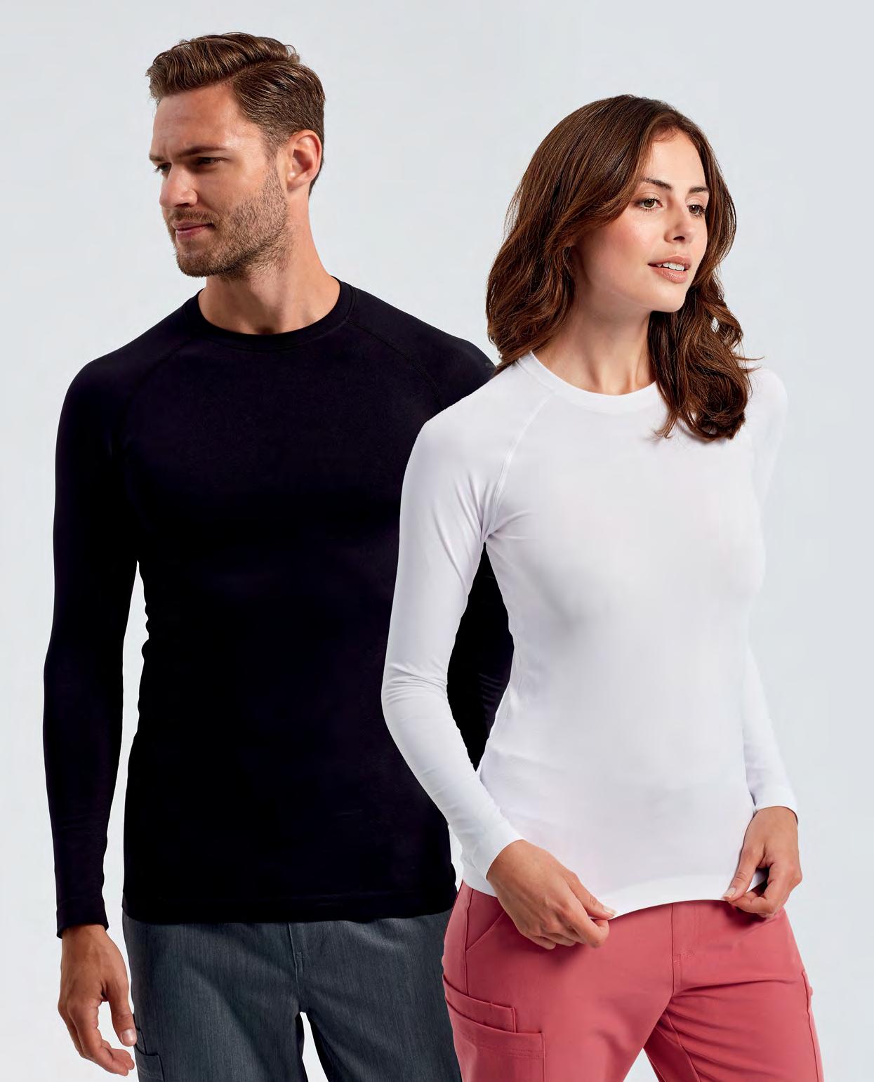 ‘Unstoppable’ Fresh Underscrub Base Layers Peppermint extract gives a natural deodorising finish without a mint scent. Seamless body with unique jacquard pattern. Breathable 4-way stretch for easy movement and all day comfort. Durable crease resistant and easycare 50% Recycled Nylon, 50% Nylon. Heathers: *50% Recycled Nylon, 30% Nylon, 20% Polyester, 170gsm 4 colours