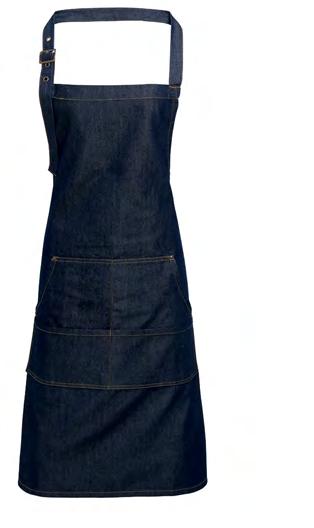 PR126 Jean Stitch Denim Bib Apron Four ‘kangaroo’ style pockets with rivet detail. 90cm self-fabric ties. Adjustable buckle on neck band. Width 72cm, length 86cm 70% Cotton, 30% Polyester, 265gsm 2 colours