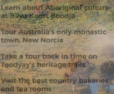 off amid summer heat. While to the east in the Avon Valley, rolling hills and sweeping countryside transform into lush fields of colourful blooms following winter rains, and vibrant towns brimming with history and heritage beckon you to come explore.