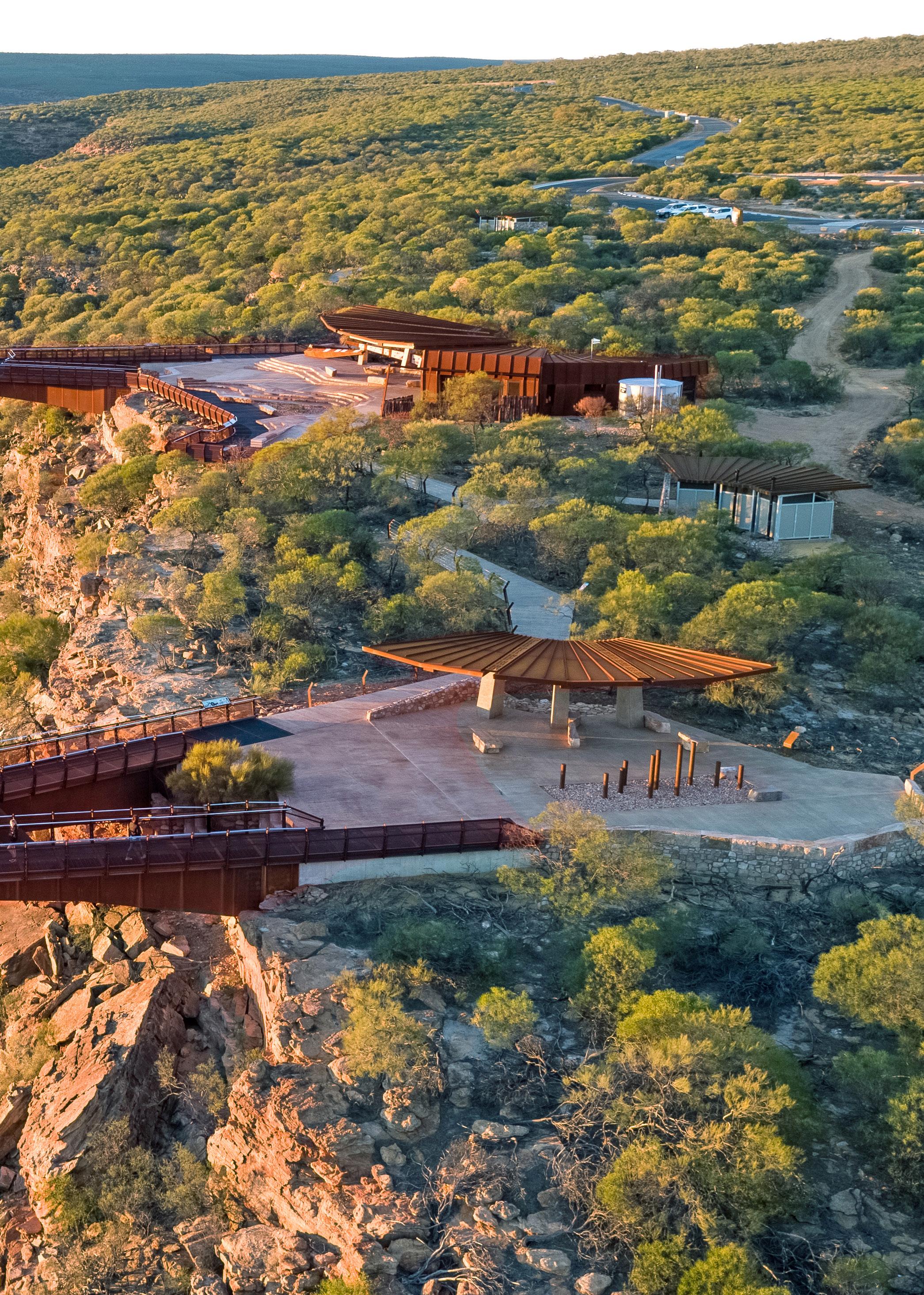 Inspired by the region’s Aboriginal heritage and beauty, several local Indigenous artists have created interpretive artwork as an important part of the Skywalk experience. This includes the Beemarra serpent, central to the dreaming story of the Nanda people, sandblasted into the walk path to guide visitors and message sticks welded with Aboriginal art to make a “forest” near the entrance of the Skywalk.