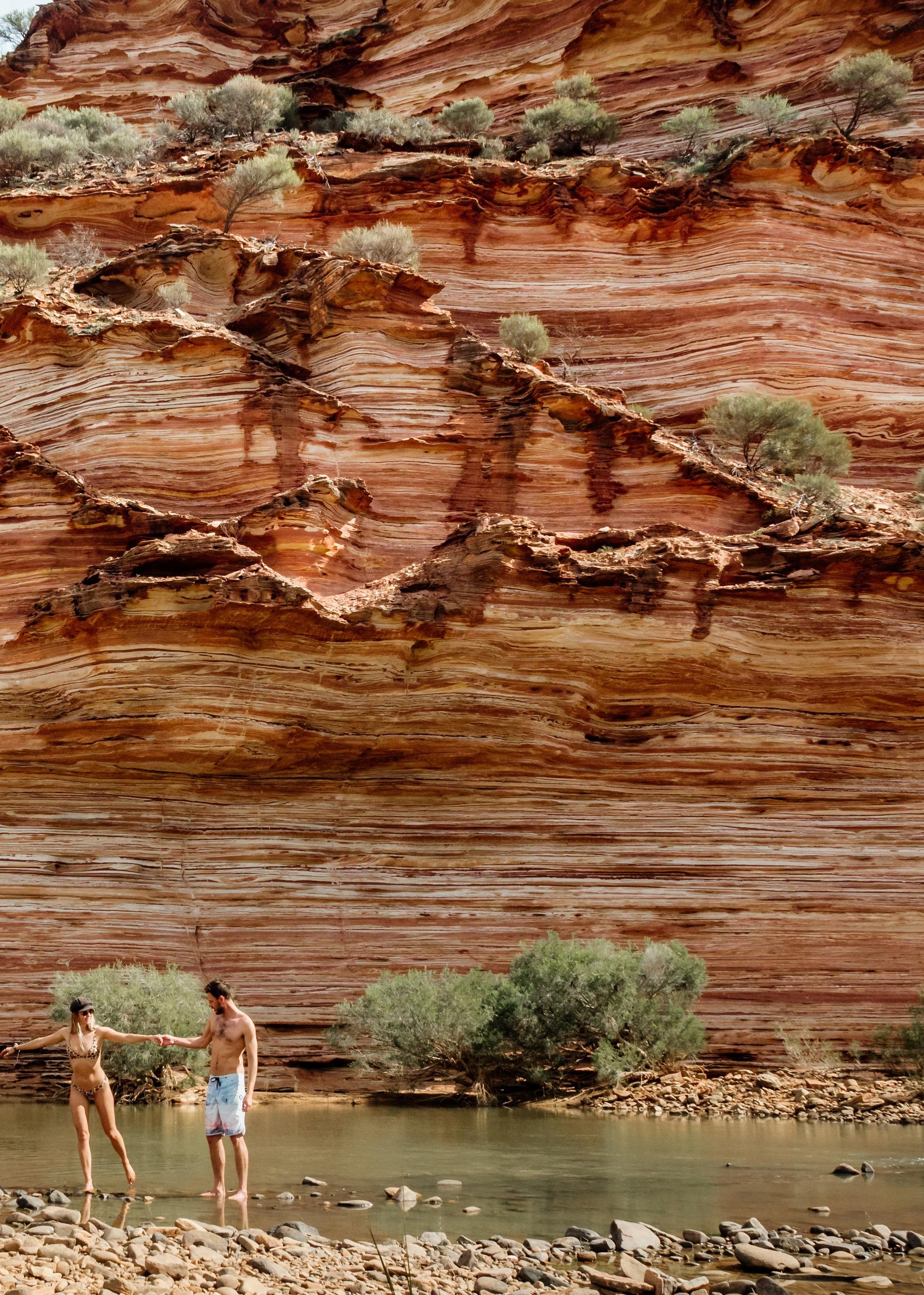 Murchison River | Celestte & Arjay @wheninroamClass 1, 200m return. Hawks Head is aptly named after the shape of the rock structure seen from the lookout. Enjoy the gorge views from the picnic area or wander down the sealed path to the lookout above the river.