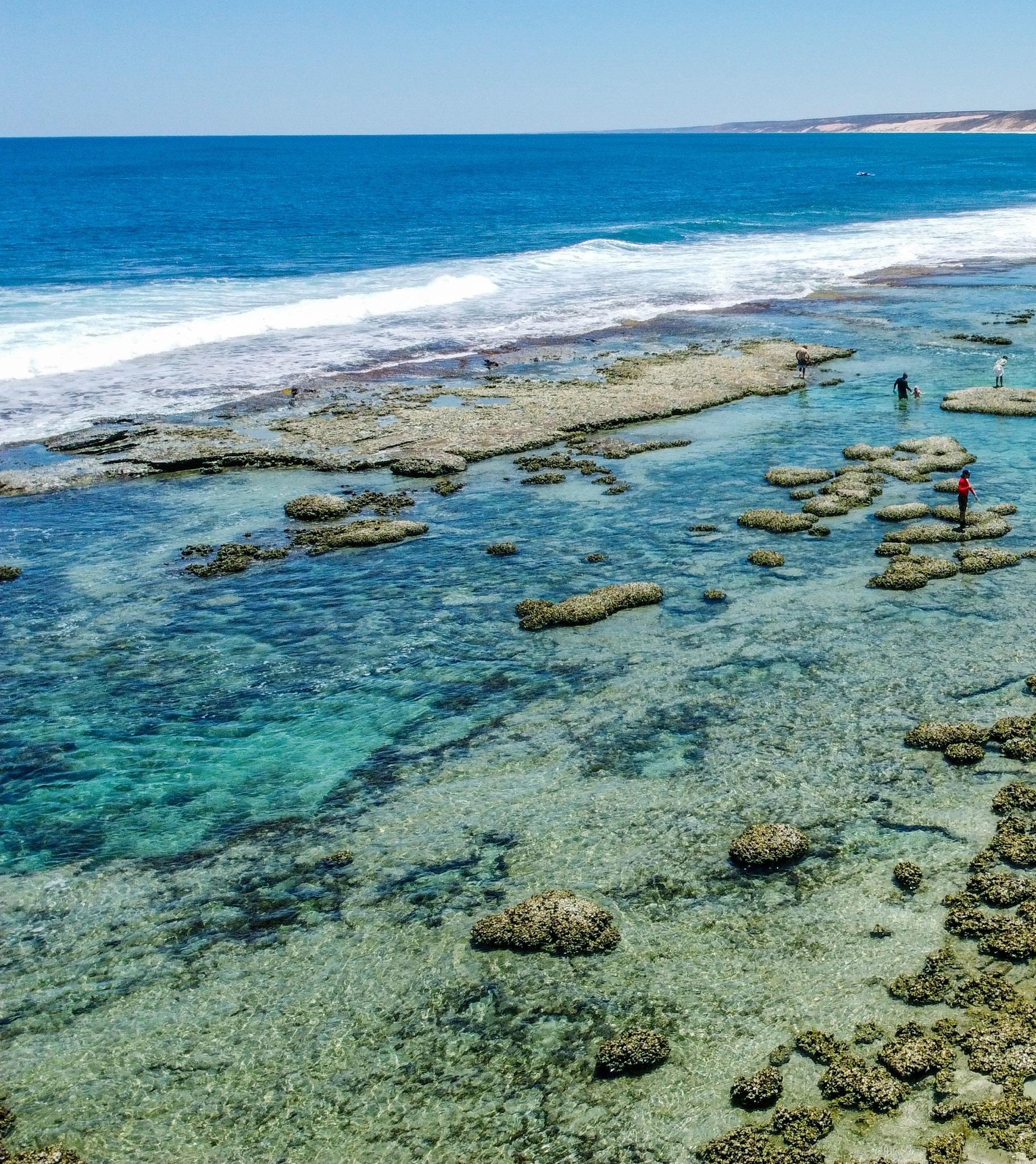A 10 minute walk from town, Back Beach is a great place for exploring rock pools at low tide. Trails from this area lead to Chinaman’s Point and the Zuytdorp memorial lookout.