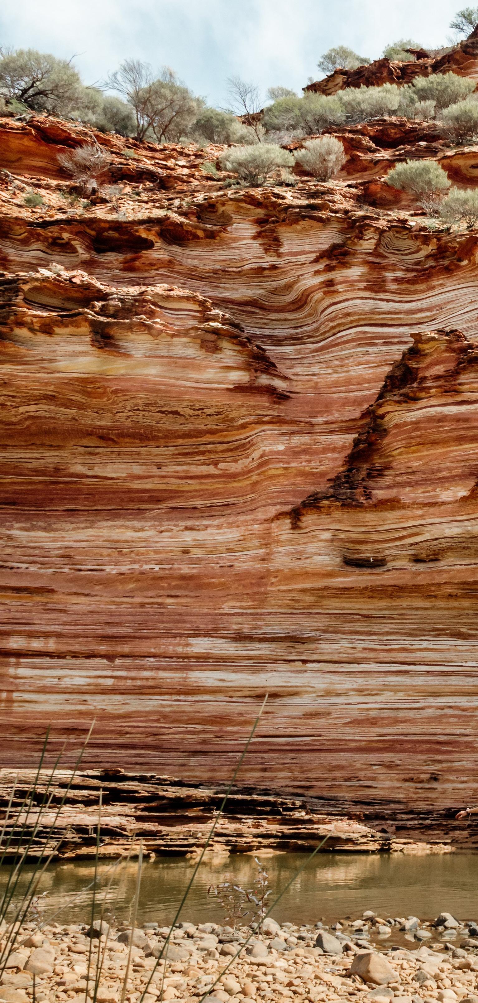 Class 3, 1.2 km return. Considered by many to offer the most breathtaking view of the park, the gorge plunges 150m down to where red river gums create a striking contrast against the earthy Tumblagooda sandstone. View the Eurypterid tracks with informative signage to explain these ancient sea scorpion impressions.