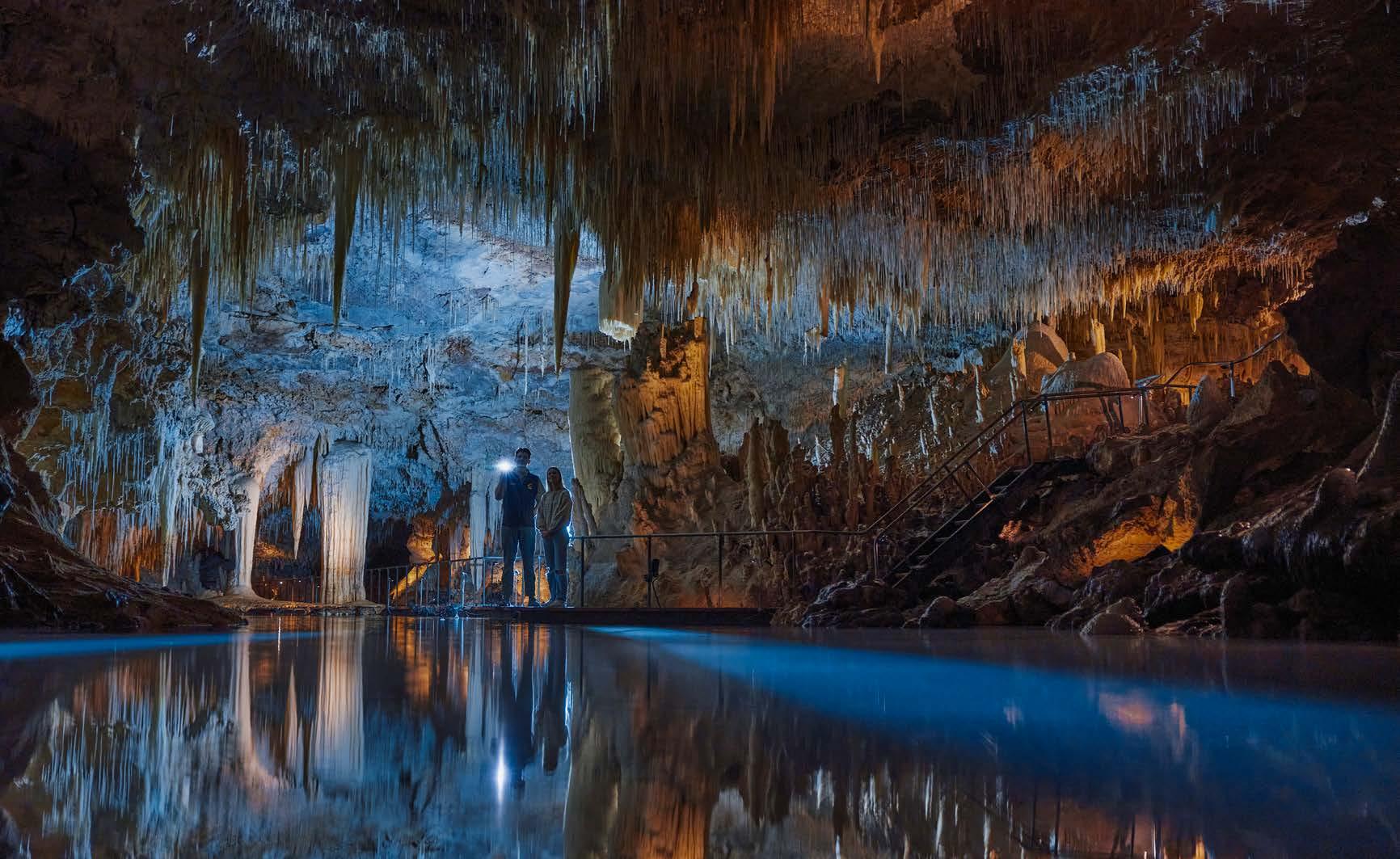 Home to ancient fossil remains of long-extinct megafauna, visitors to Mammoth Cave will come face-to-face with a 44,000-year-old ‘zygomaturus’ jawbone embedded in the cave wall, an ancient beast that is comparable to a giant wombat. A natural time capsule, this cave system is well known for its many stalactites and stalagmites that hang from the ceiling and stand tall from the floor. A visit to Mammoth Cave is complete with a winding walk through a beautiful marri forest with wildflowers dotting the paths during spring.