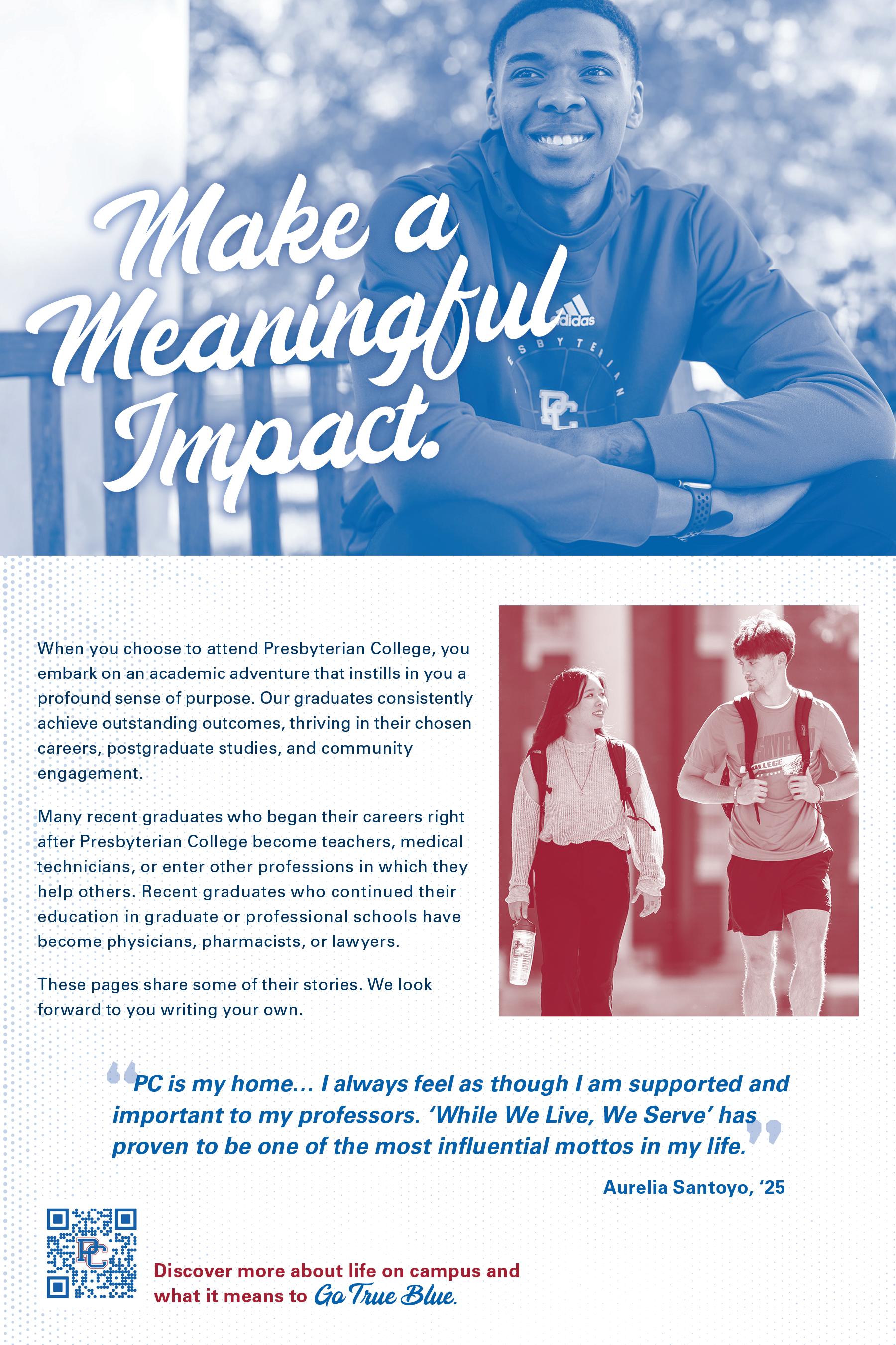 Where can a Presbyterian College education take you? At PC, students are pushed academically, tapping into their full potential and achieving more than they thought possible. These stories of recent PC grads show you a glimpse of what's possible for you at PC.