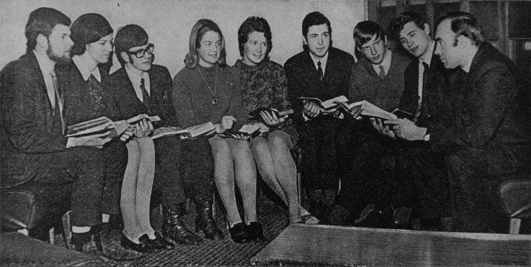 Rev Douglas Armstrong, convener of the Hostel Management committee and minister of Strand Presbyterian Church, talking to a group of young residents, some of whom have been in residence for two or three years. The group, which is led by schoolteacher Billy Campbell (third from left), meets weekly for Bible study. Included in the photograph, from left to right, are: Winston Feather, Yorkshire, working in Royal Victoria Hospital; Carol McCullough, Kilkeel, third Pharmacy QUB; Billy Campbell; Doris McFarland, Cullybackey, third year QUB; Etta Hanna, Kilkeel, fourth year Medic QUB; Ronnie Pollock, Portadown, Rupert Stanley College; David Thompson, Londonderry, first year Science QUB; Derek Hutchinson, Londonderry, first year Science QUB; Douglas Armstrong.