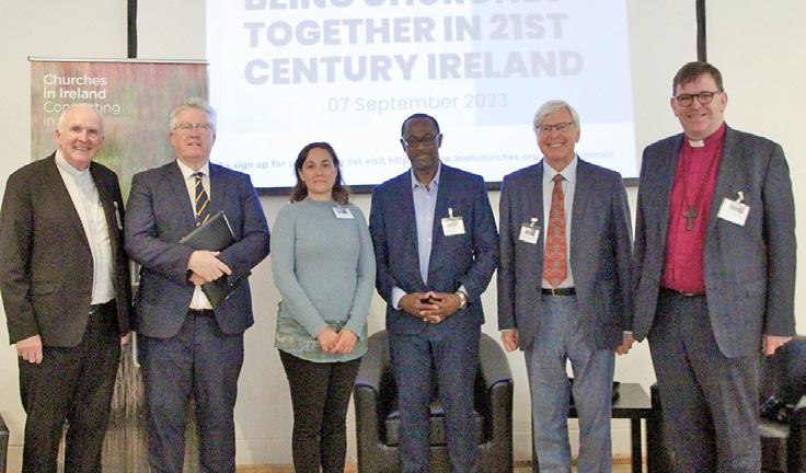 Pictured are (L–R): Bishop Brendan Leahy (IICM co-chair), Prof Daire Keogh (DCU president), Dr Nicola Brady (CTBI general secretary), Rev Dr Livingstone Thompson (Moravian Church), Prof Philip McDonagh (DCU) and Bishop Andrew Froster (IICM co-chair).