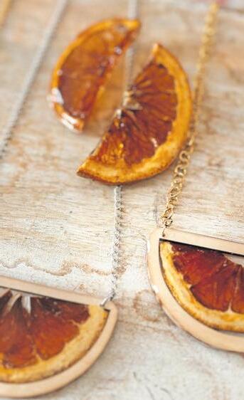 Cada pieza es confeccionada a mano, con la técnica de encapsulado, con ores naturales, principalmente girasoles y ores cosmos, pero la especialidad de la marca es trabajar con esqueletos de hojas y frutas, arena, lápices de colores y periódico.