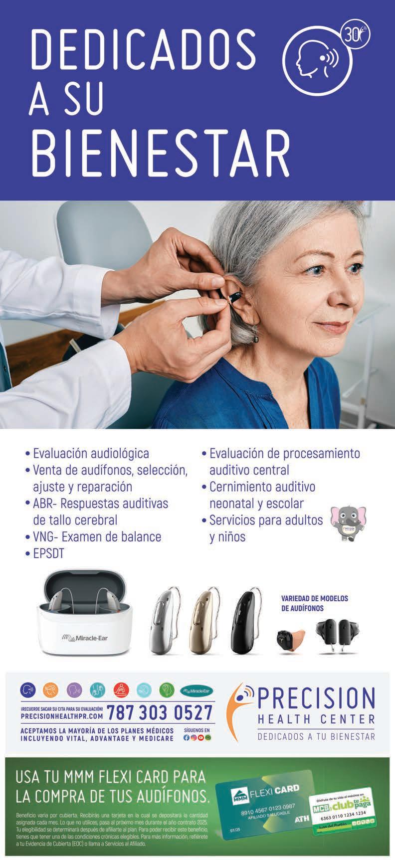 Para obtener una evaluación completa a cargo de expertos, puede llamar al 787-3030527 o visitar una de las clínicas alrededor de toda la isla. Entre los servicios se ofrecen: evaluación audiológica; venta de audífonos, selección, ajuste y reparación; evaluación de procesamiento auditivo central; examen de balance; cernimiento auditivo neonatal y escolar; y servicios para adultos y niños, entre otros. Para más información, visite la página web, precisionhealthpr.com o por medio de las redes sociales, Facebook e Instagram como Precision Health PR.