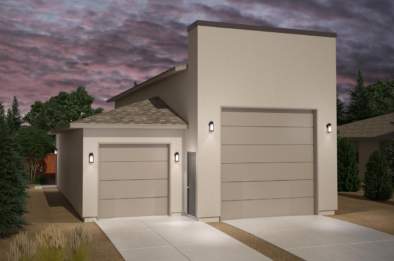 • Modern Steel™ Collection roll-up garage doors coordinating with each unique elevation